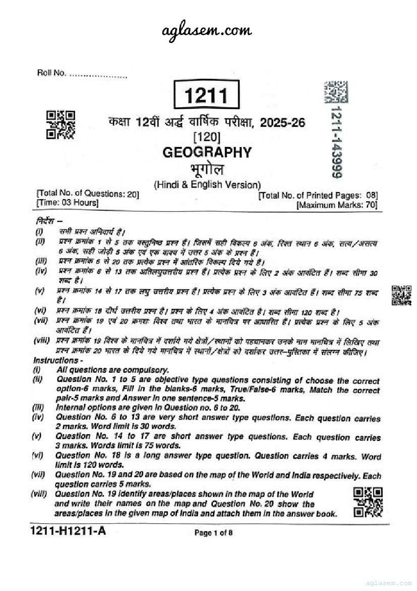 | Paper | Madhya Pradesh Class 12 Geography Ardhvaarshik Pariksha Question Paper |