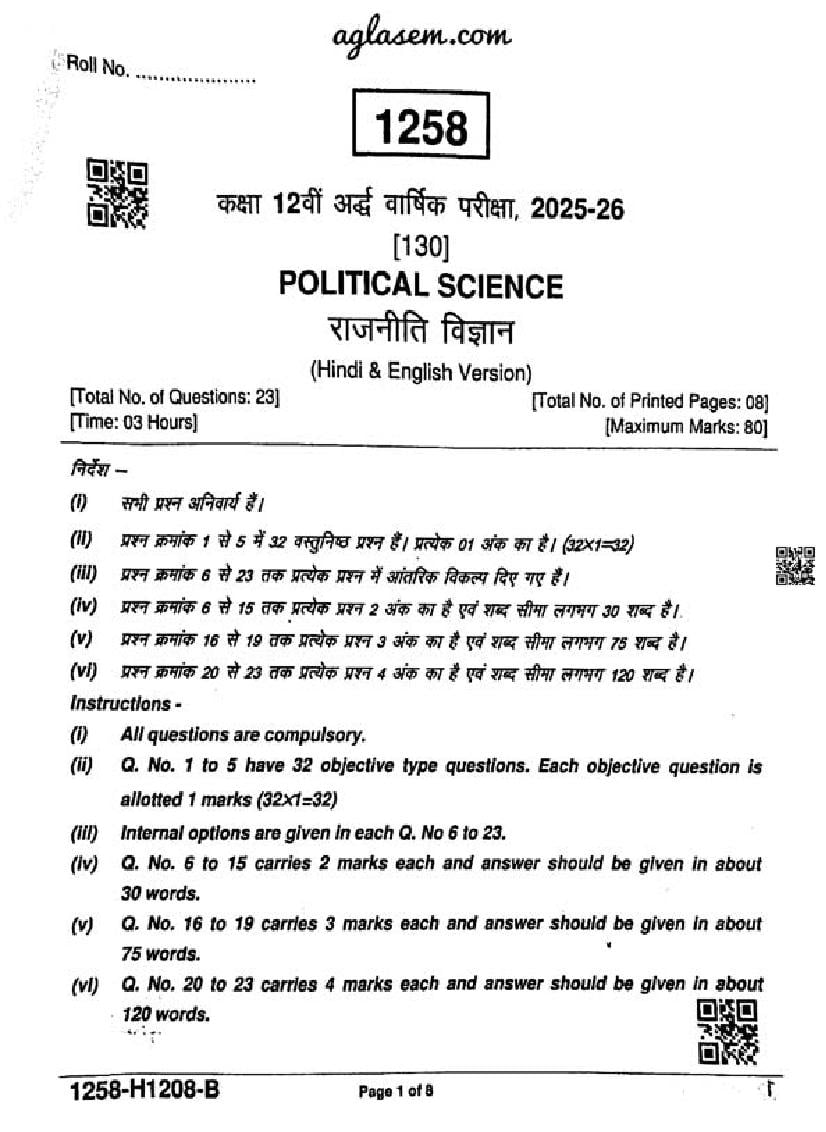 After solving the ardhvaarshik pariksha paper of Political Science, you can download the half-yearly exam question papers for all subjects of class 12.