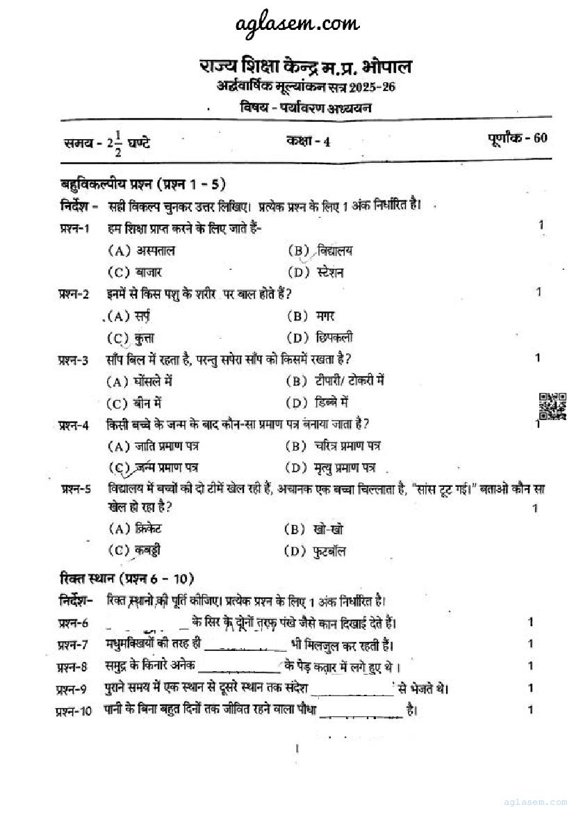 MP Board Class 4th EVS Ardhvaarshik Paper 2025-26