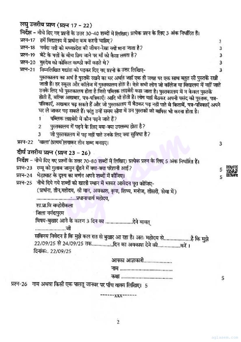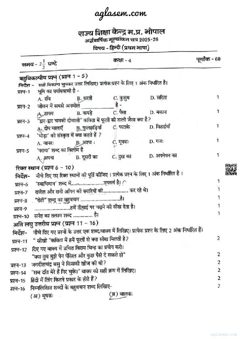 MP Board Class 4th Hindi Ardhvaarshik Paper 2025-26