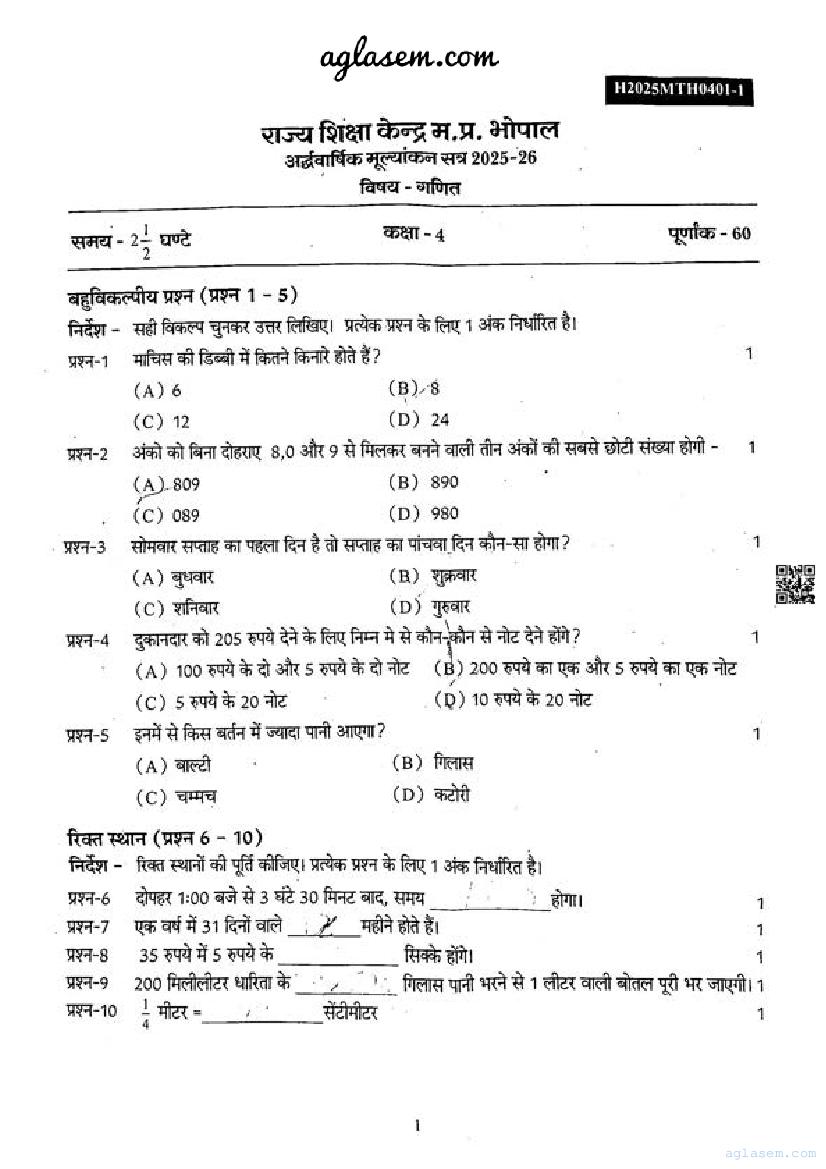 | Paper | Madhya Pradesh Class 4 Maematics Ardhvaarshik Pariksha Question Paper |