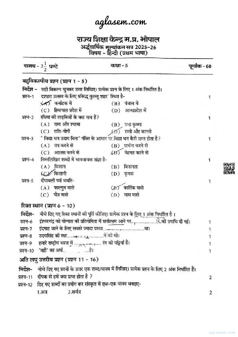MP Board Class 5th Hindi Ardhvaarshik Paper 2025-26