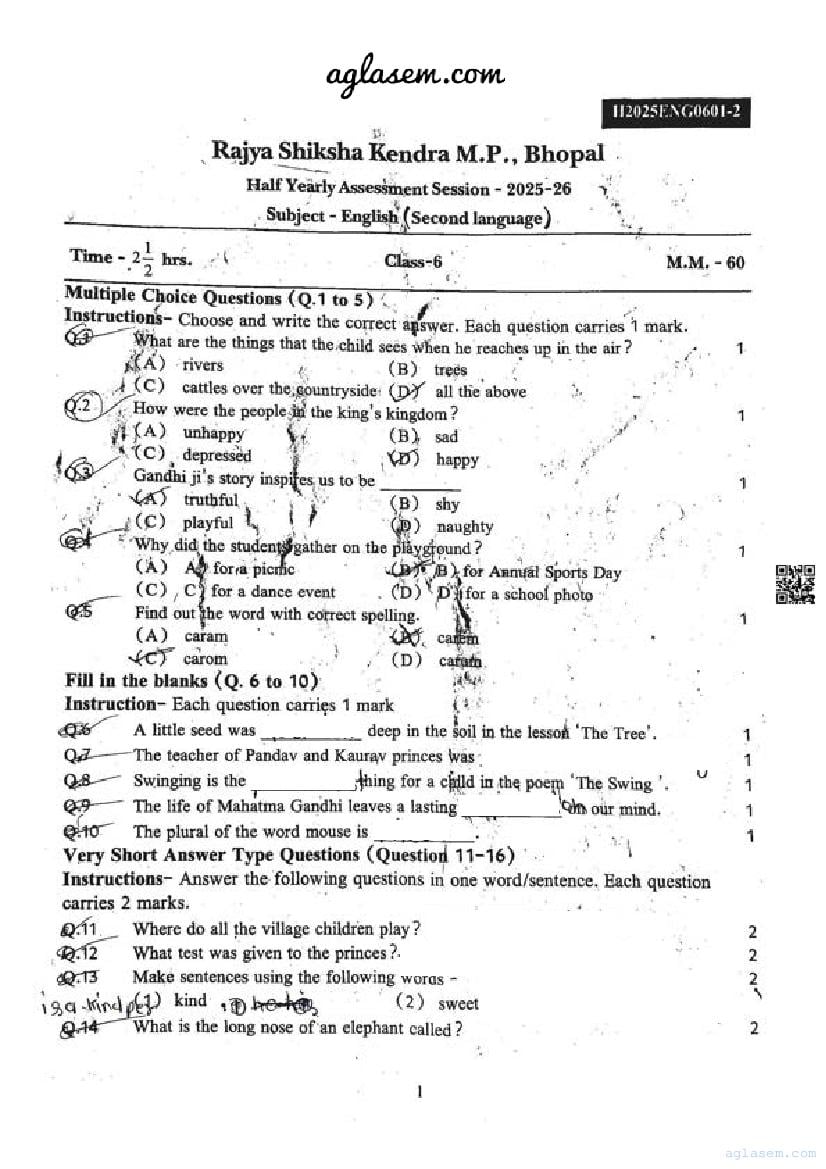 | Paper | Madhya Pradesh Class 6 English Ardhvaarshik Pariksha Question Paper |
