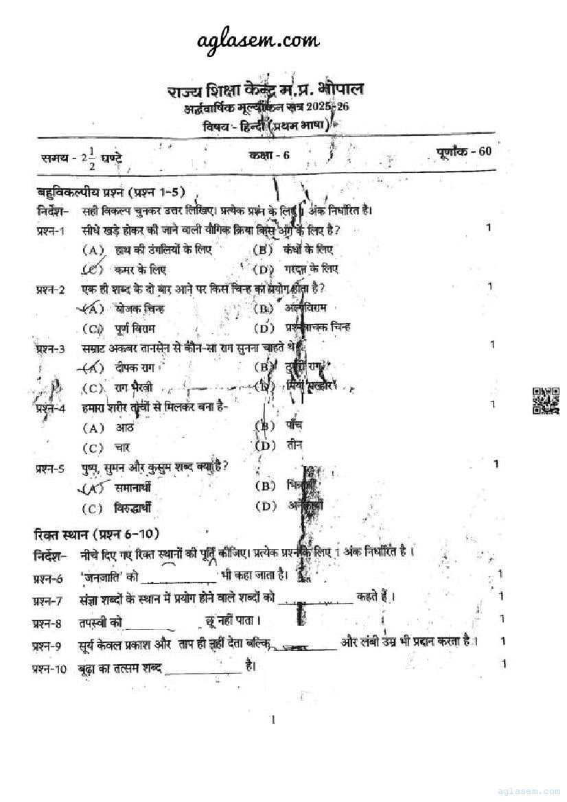MP Board Class 6th Hindi Ardhvaarshik Paper 2025-26