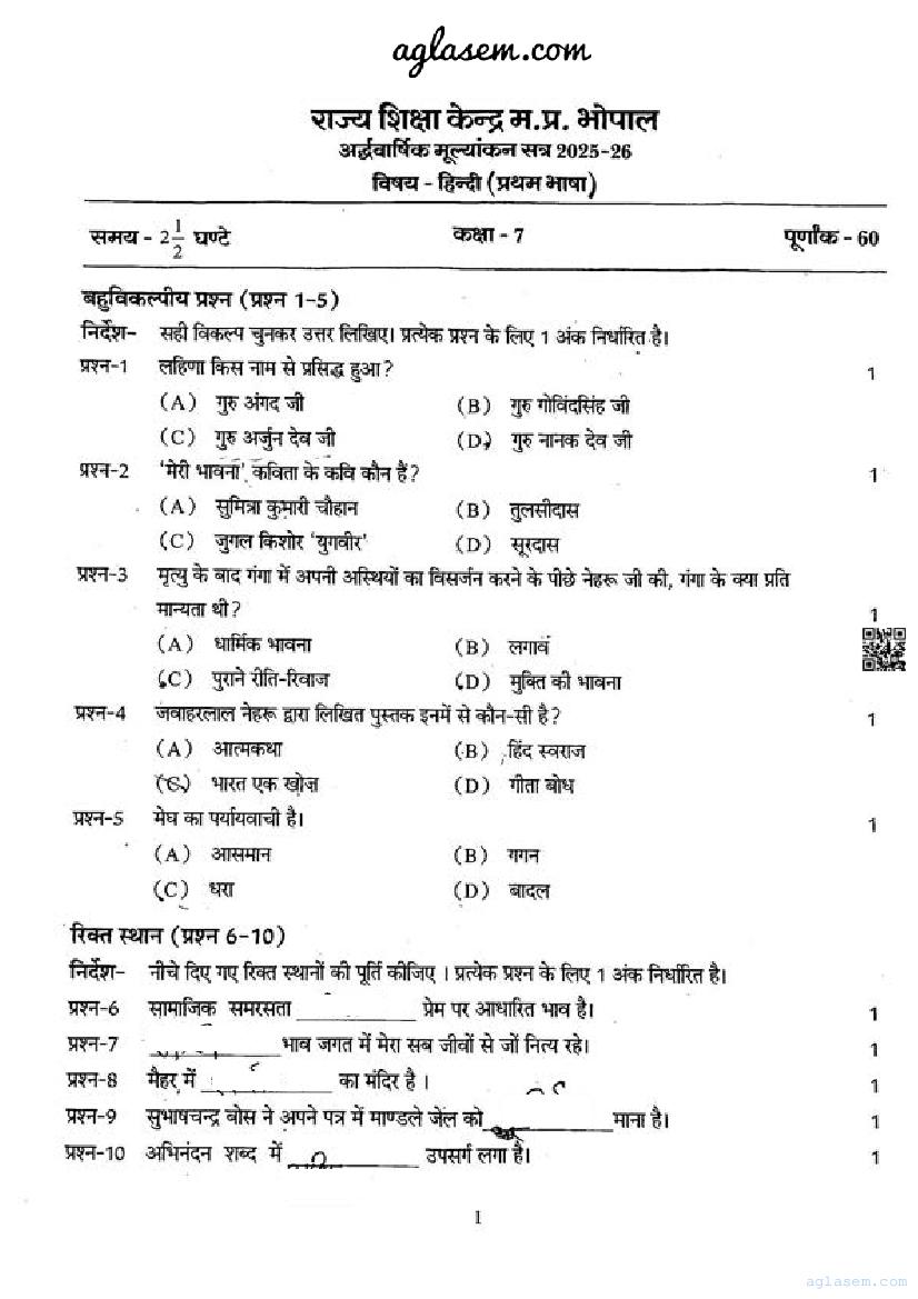 MP Board Class 7th Hindi Ardhvaarshik Paper 2025-26