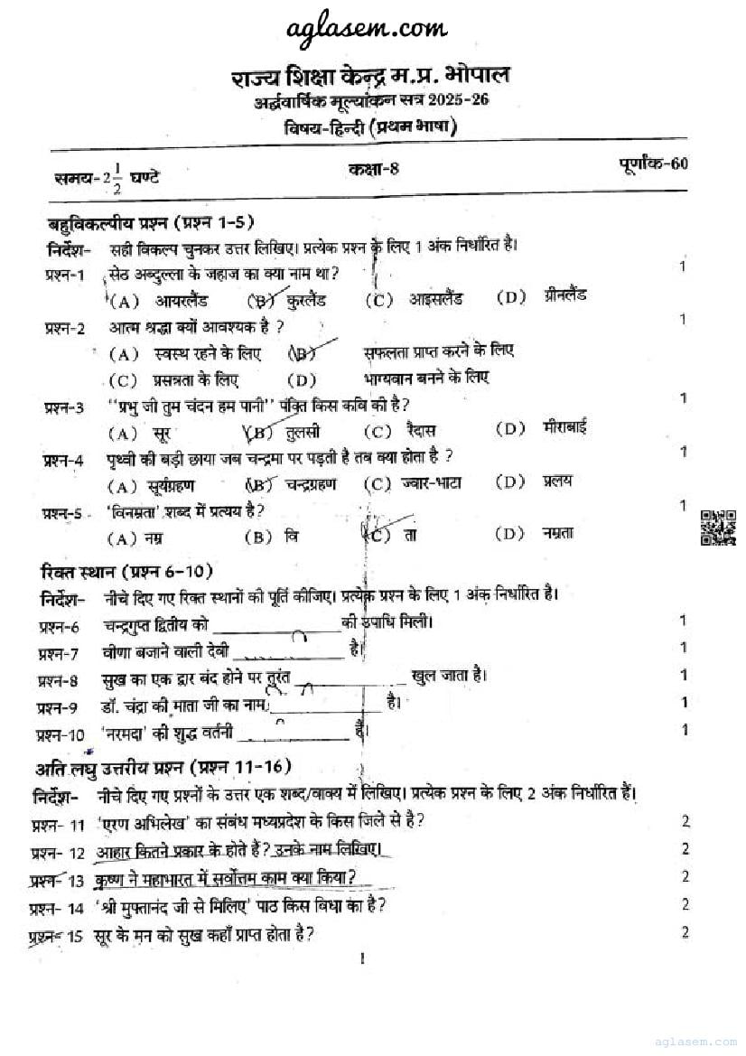 MP Board Class 8th Hindi Ardhvaarshik Paper 2025-26