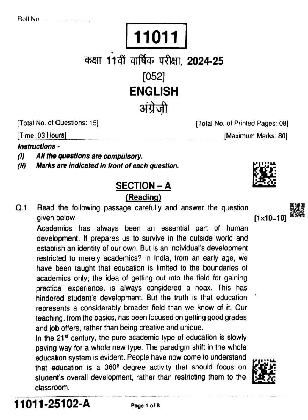 It is a good idea to download the class 11 question paper from aglasem for English subject, using above link or view pdf below.