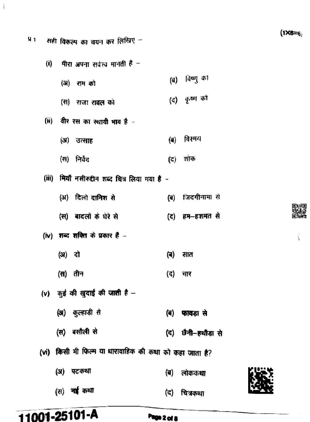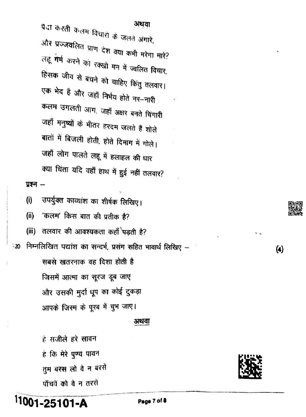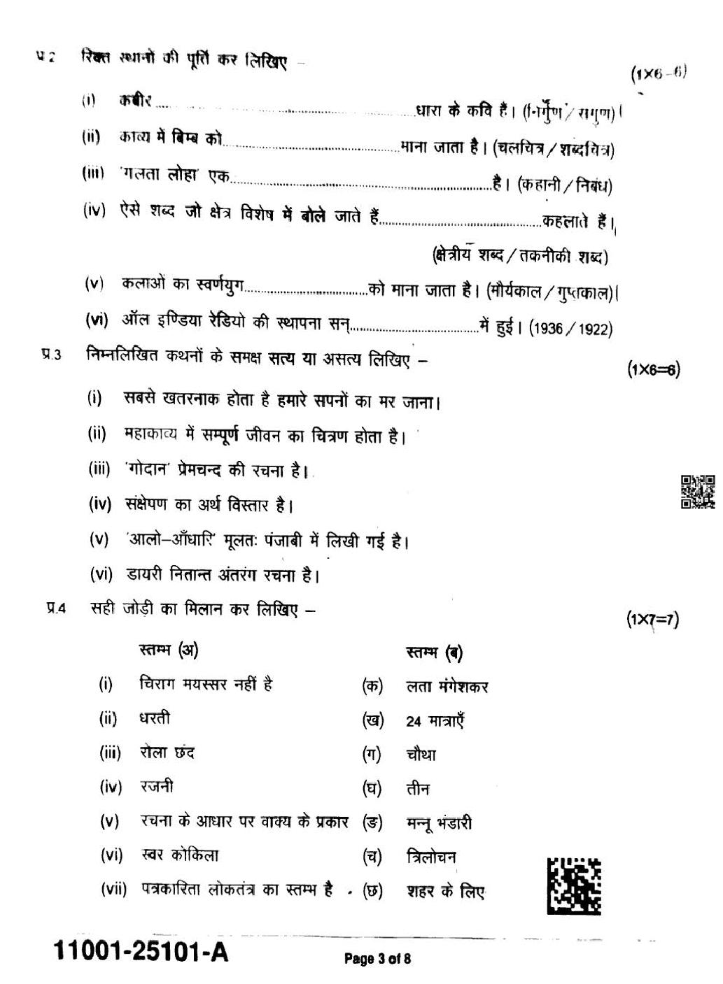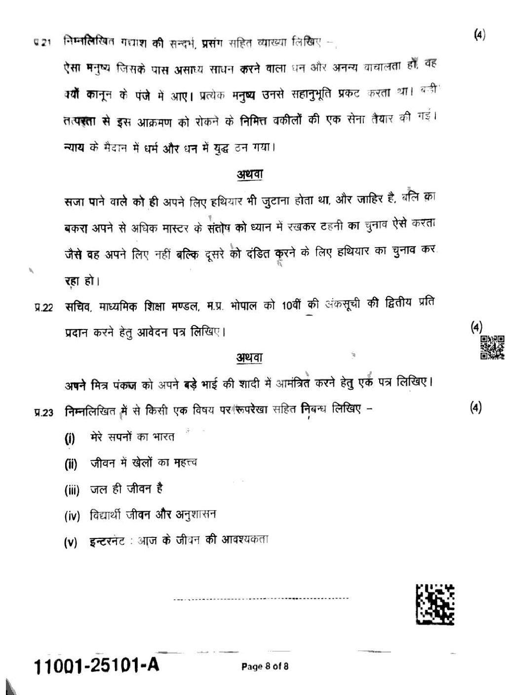 MP Board Class 11 Hindi Question Paper