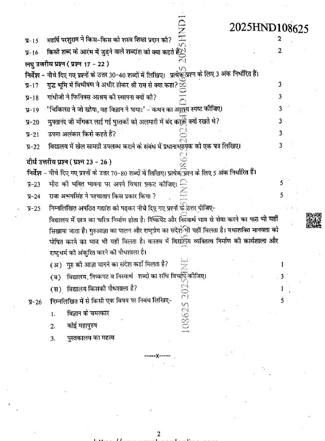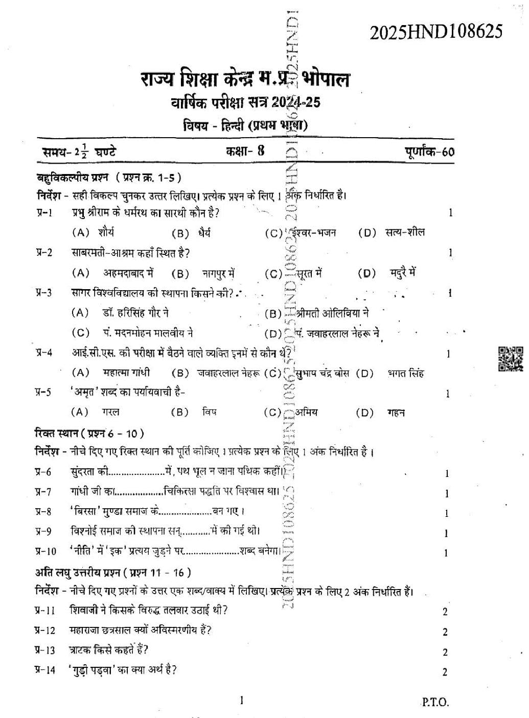 MP Board Class 8 Question Paper 2025 Hindi First Language View Download
