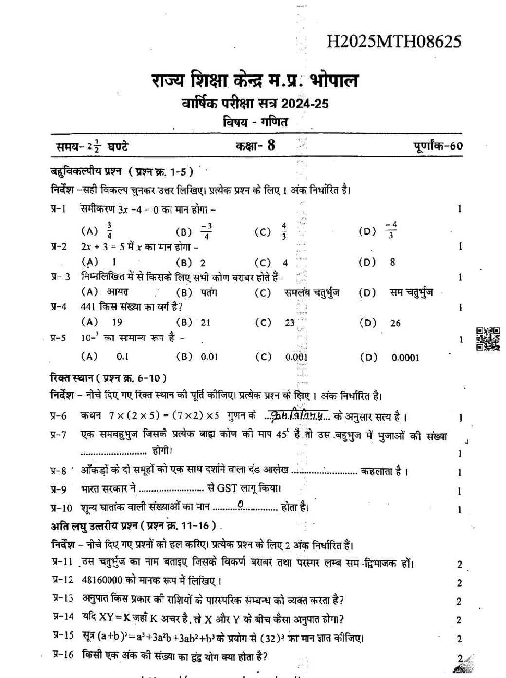 MP Board Class 8 Question Paper 2025 Mathemaics View Download
