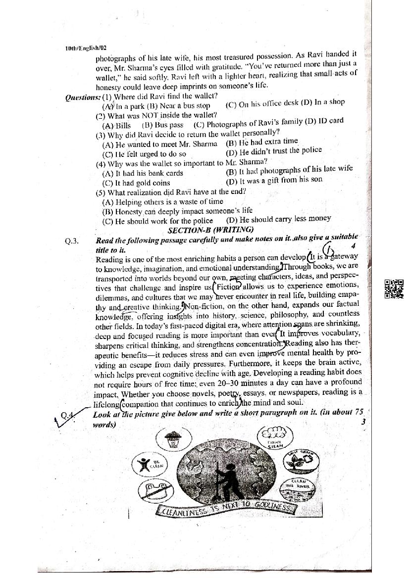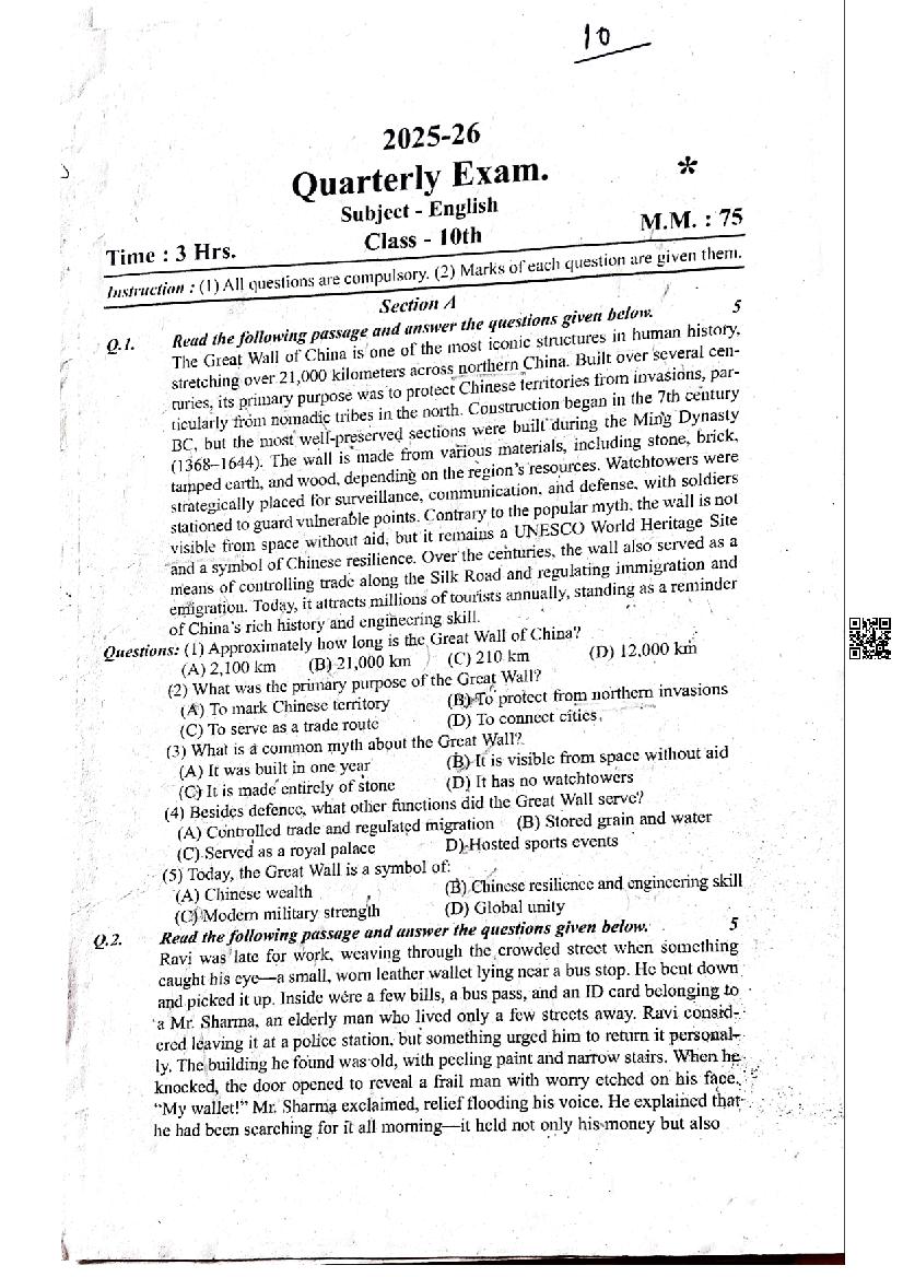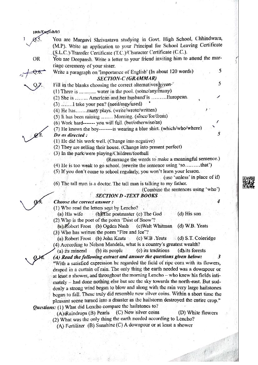 The MP Board Question Paper of class 10 Trimasik Exam for English subject is as follows.