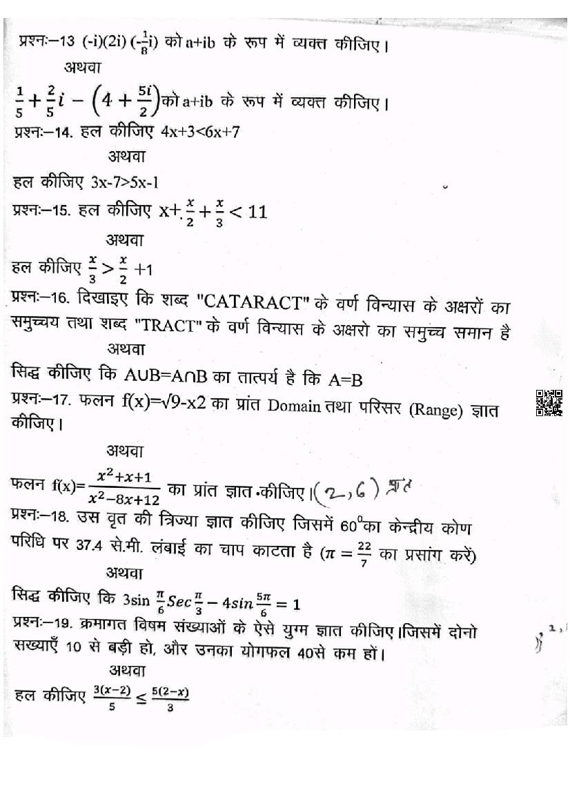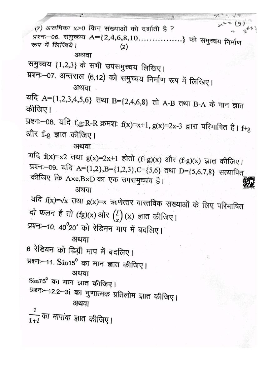 The MP Board Question Paper of class 11 Trimasik Exam for Maths subject is as follows.