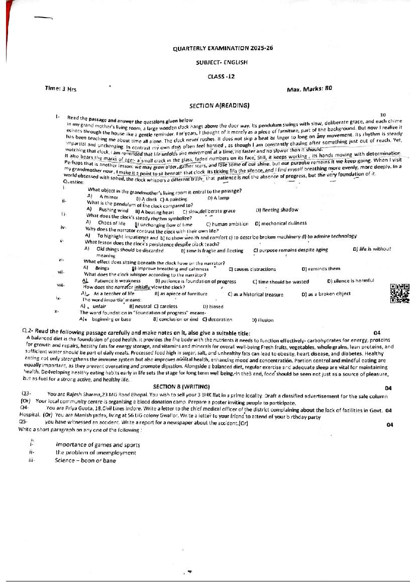 MP Board Class 12 Quarterly Question Paper 2025 English View Download