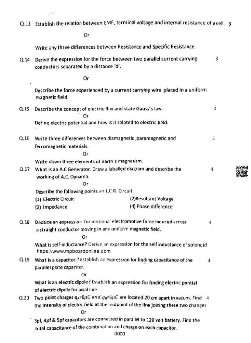 MP Board Class 12 Quarterly Question Paper 2024 Physics View Download