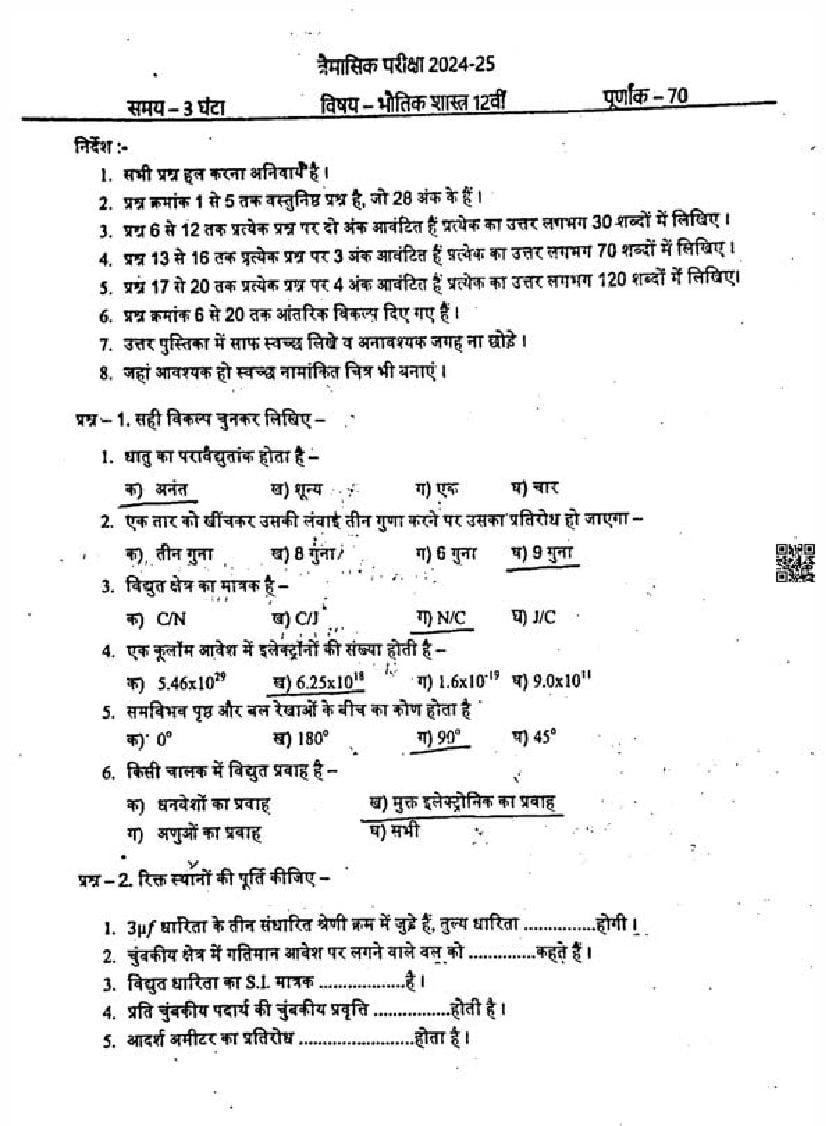 After solving the trimasik pariksha paper of Physics, you can download the quarterly exam question papers for all subjects of class 12.