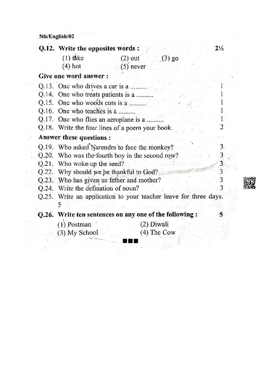 It is a good idea to download the class 5 English question paper from aglasem, using above link. However if you want to read all the questions in 5th standard trimasik pariksha for English, then you can also view the complete English question paper here itself. The entire contents of the trimasik pariksha question paper for class 5 English are as follows.