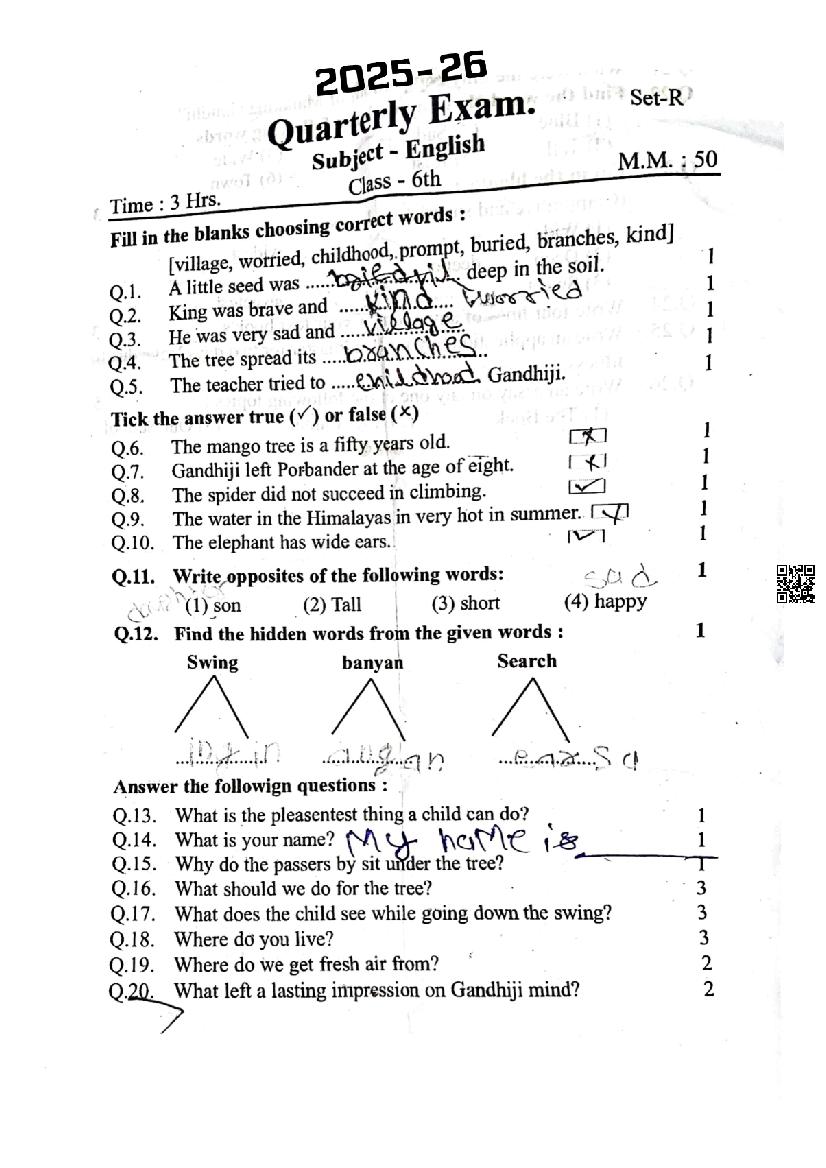 MP Board Class 6 Quarterly Question Paper 2025 English View Download