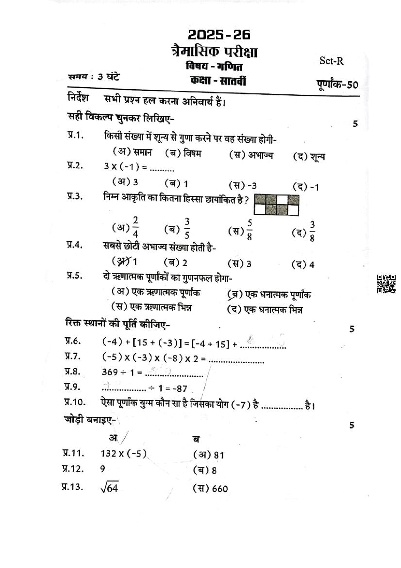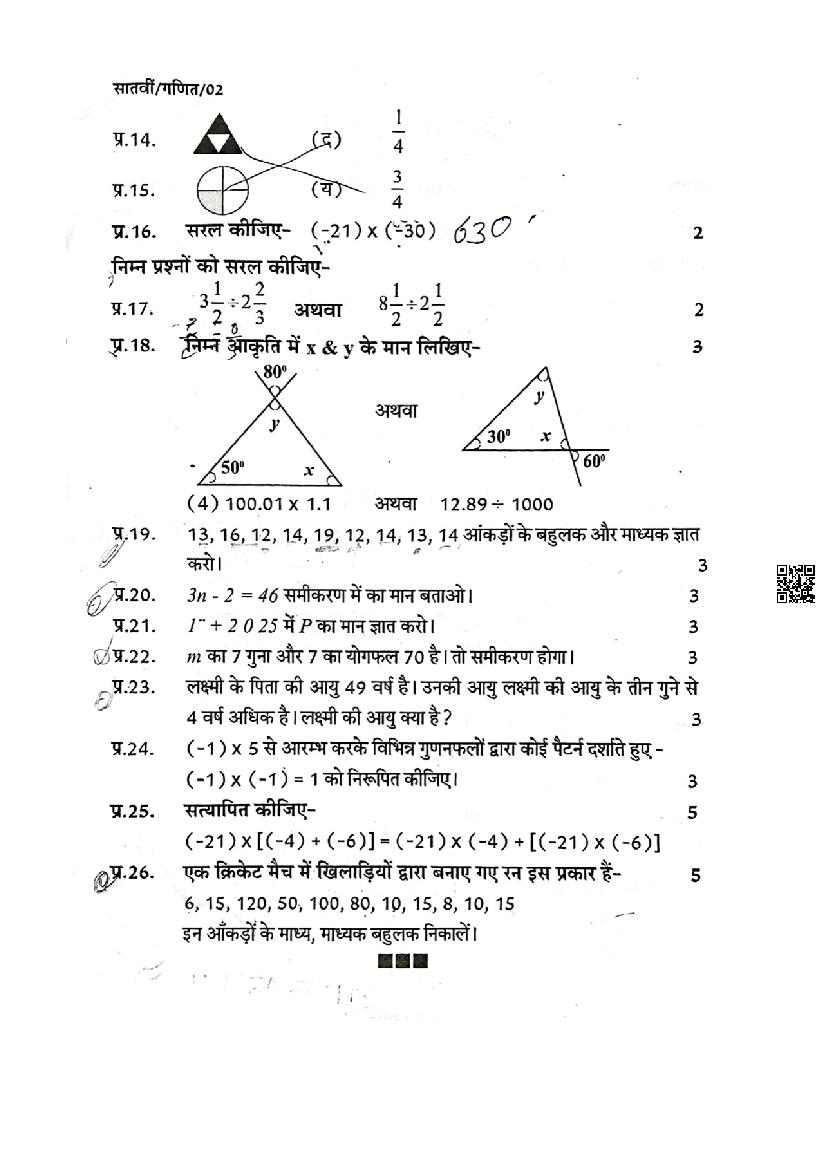 MP Board Class 7th Maths Trimasik Paper 2026