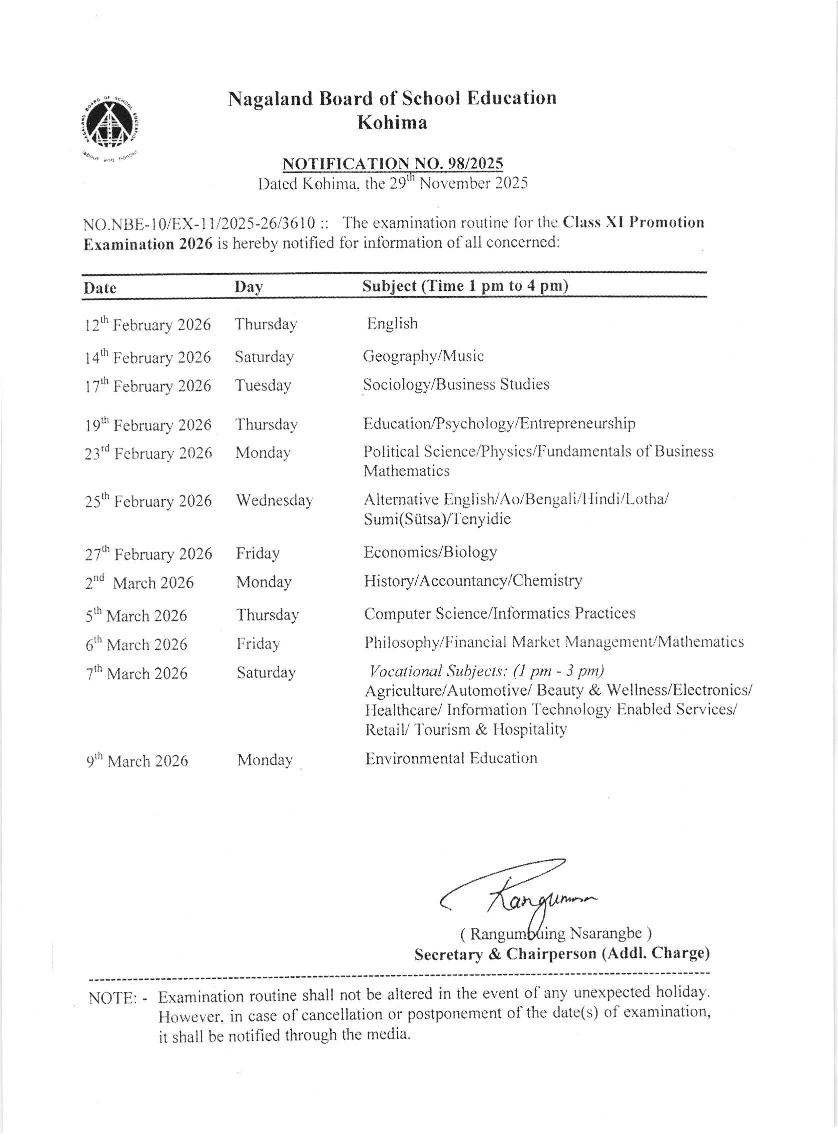 The exam date sheet of Nagaland Board for Class 11 exams are as follows.