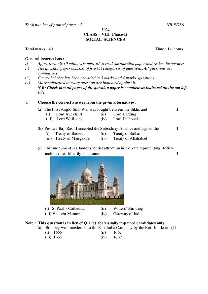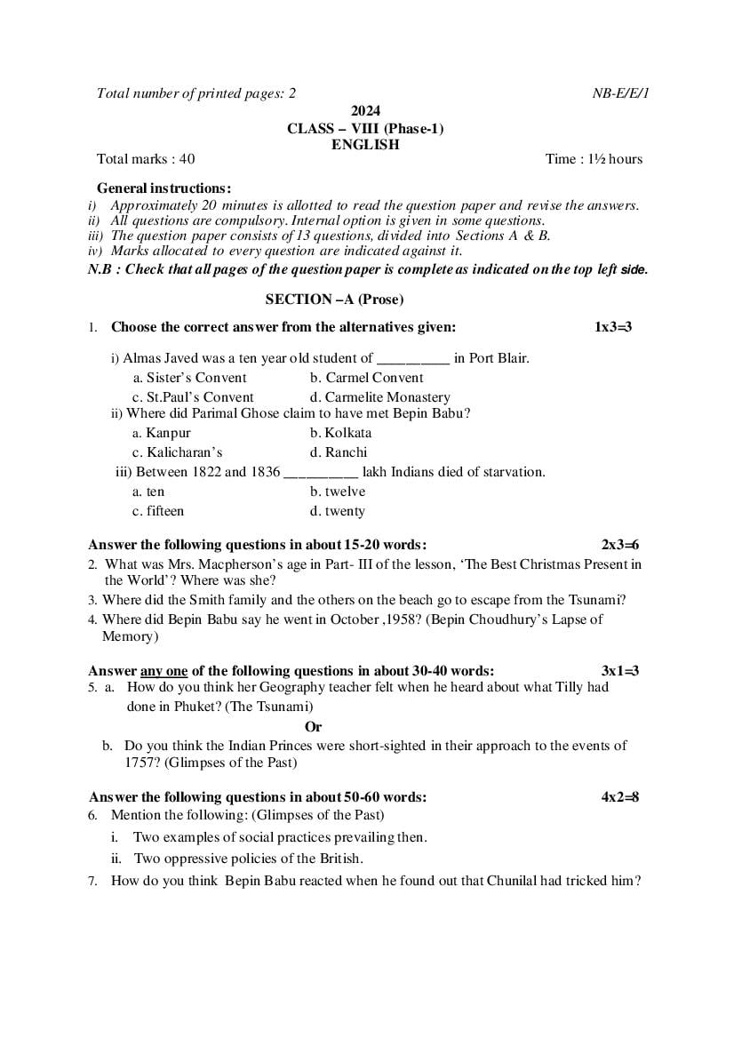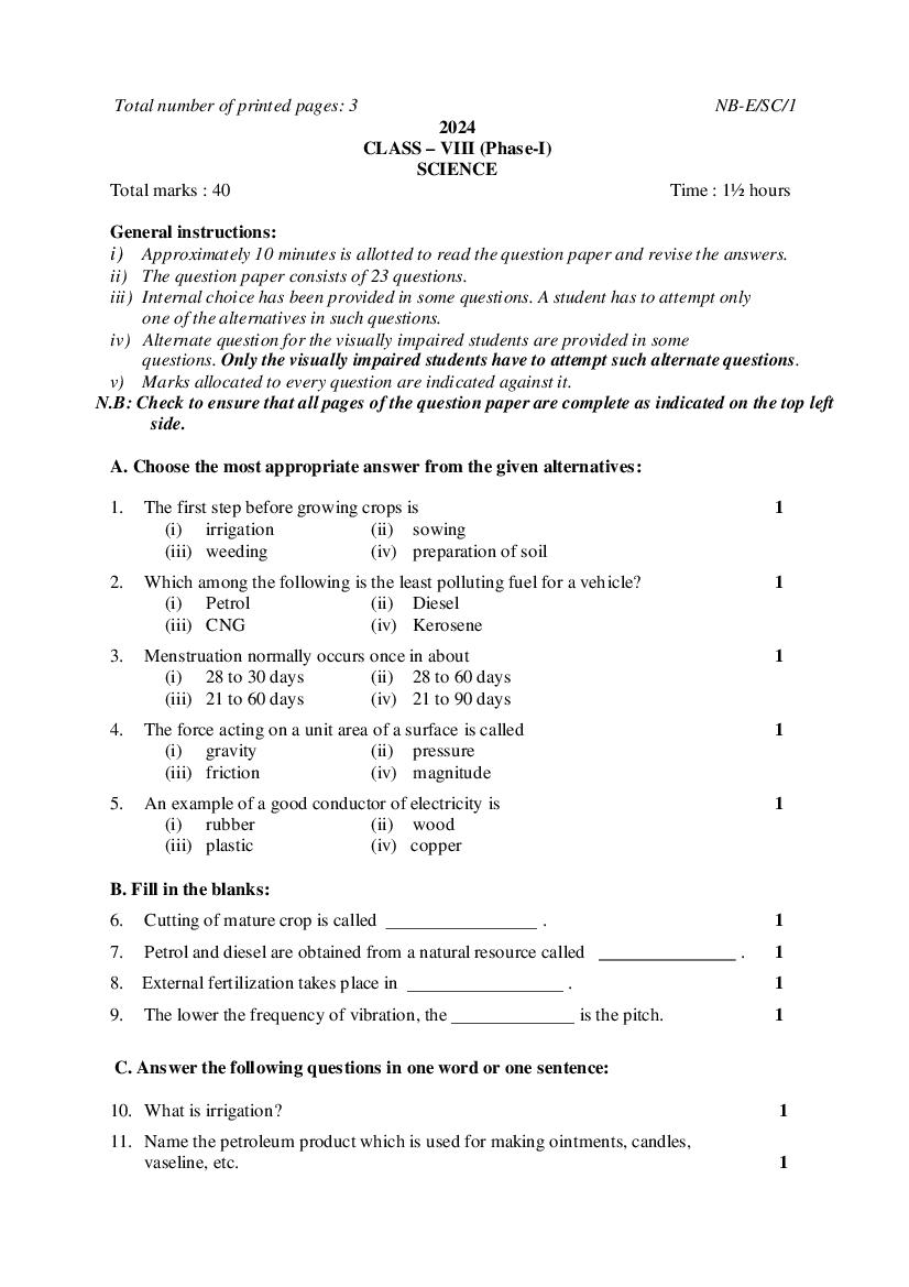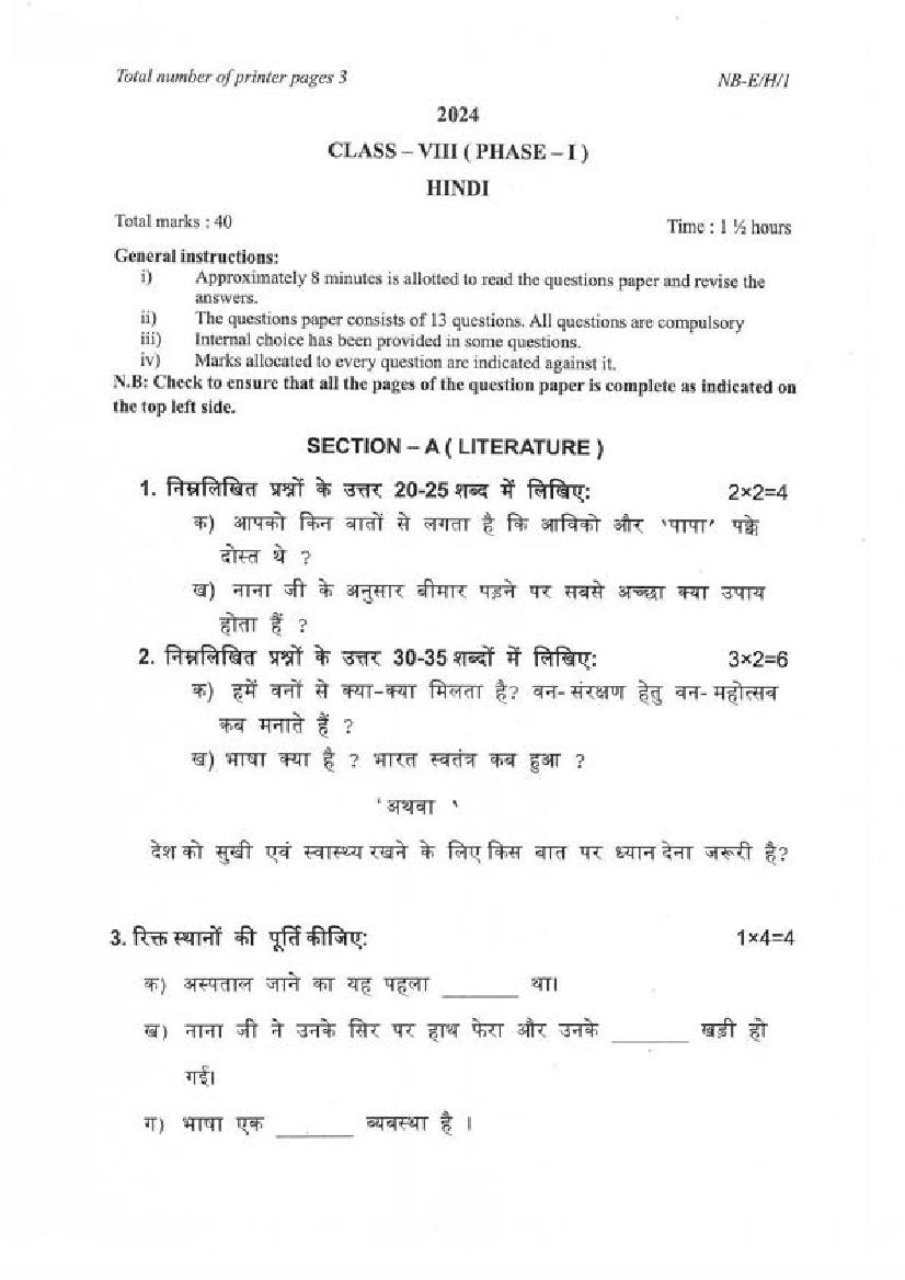 NBSE Class 8 Question Paper 2024-25 Phase 1 View Download