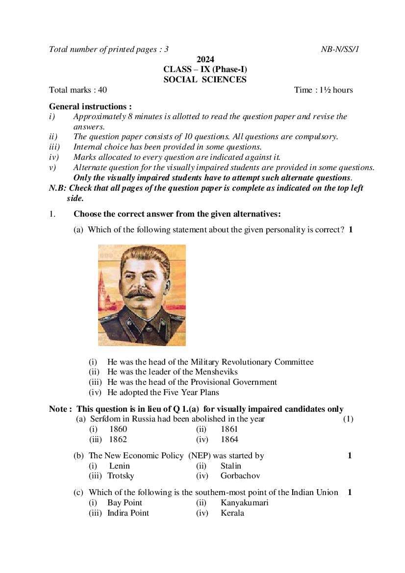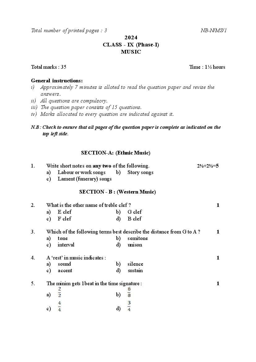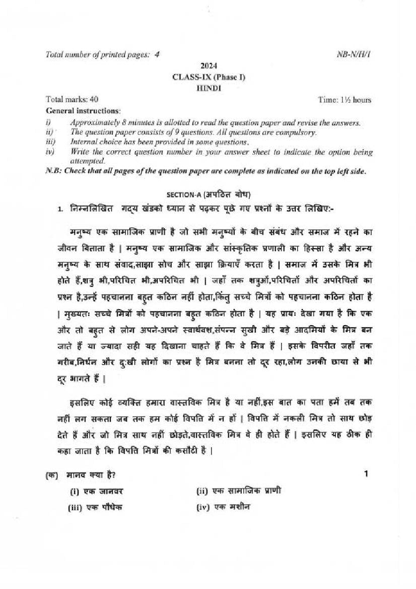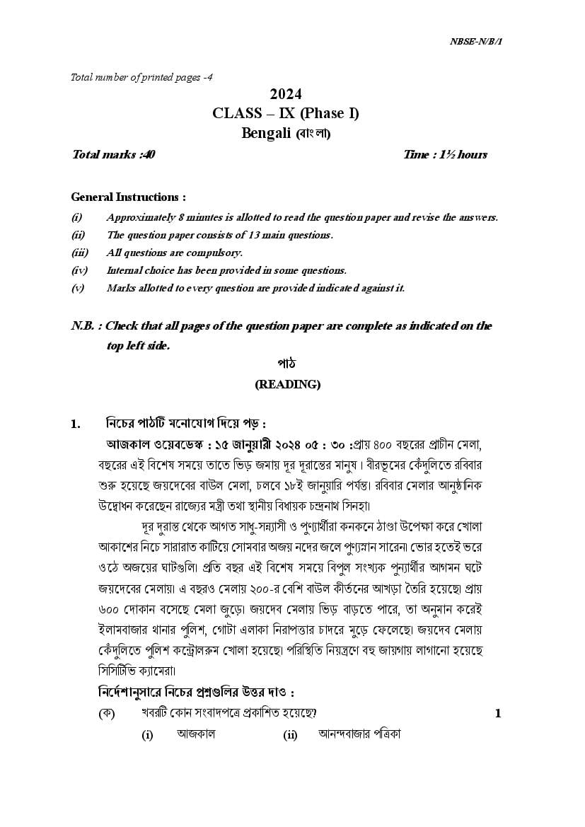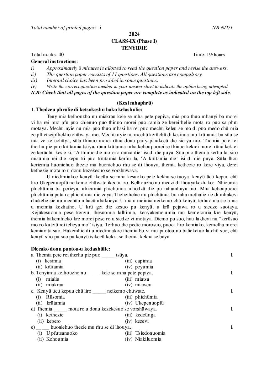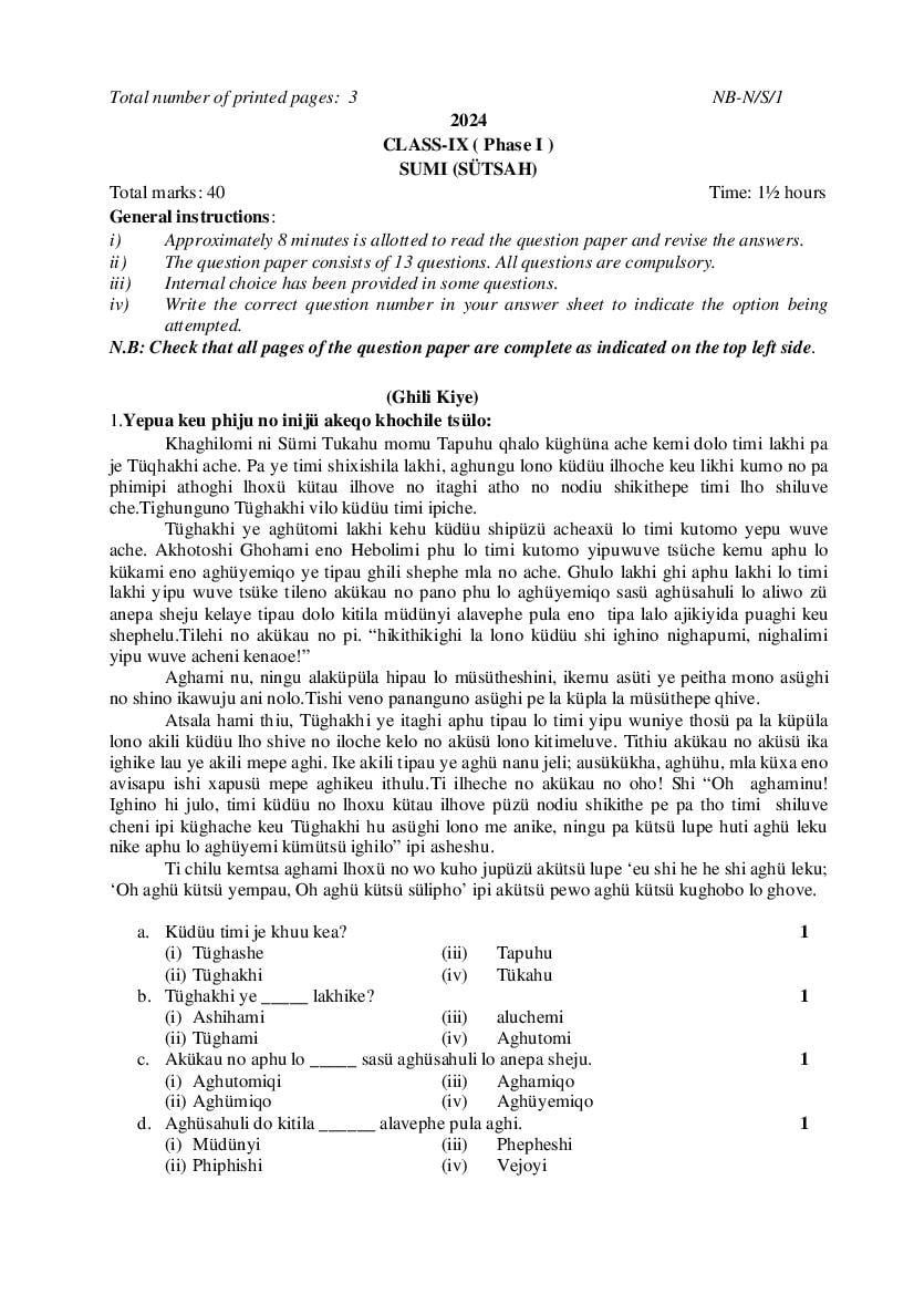 NBSE Class 9 Question Paper 2024-25 Phase 1 View Download