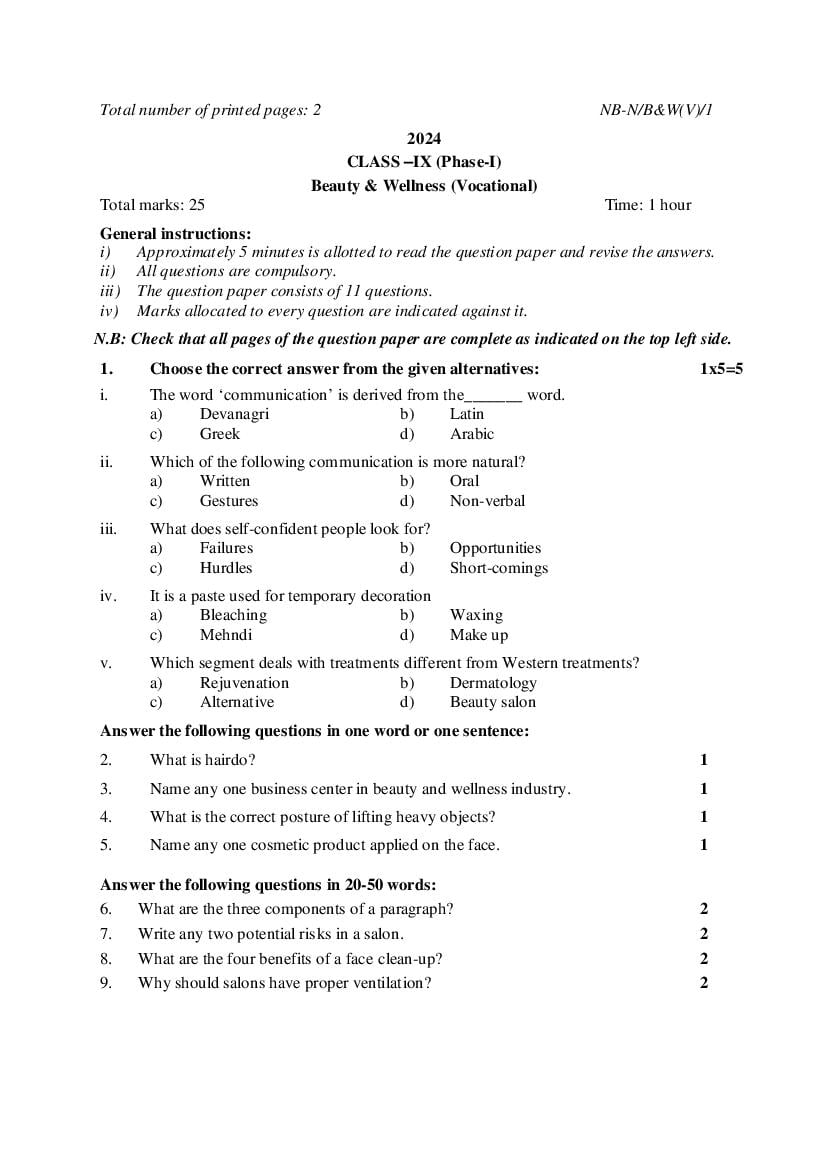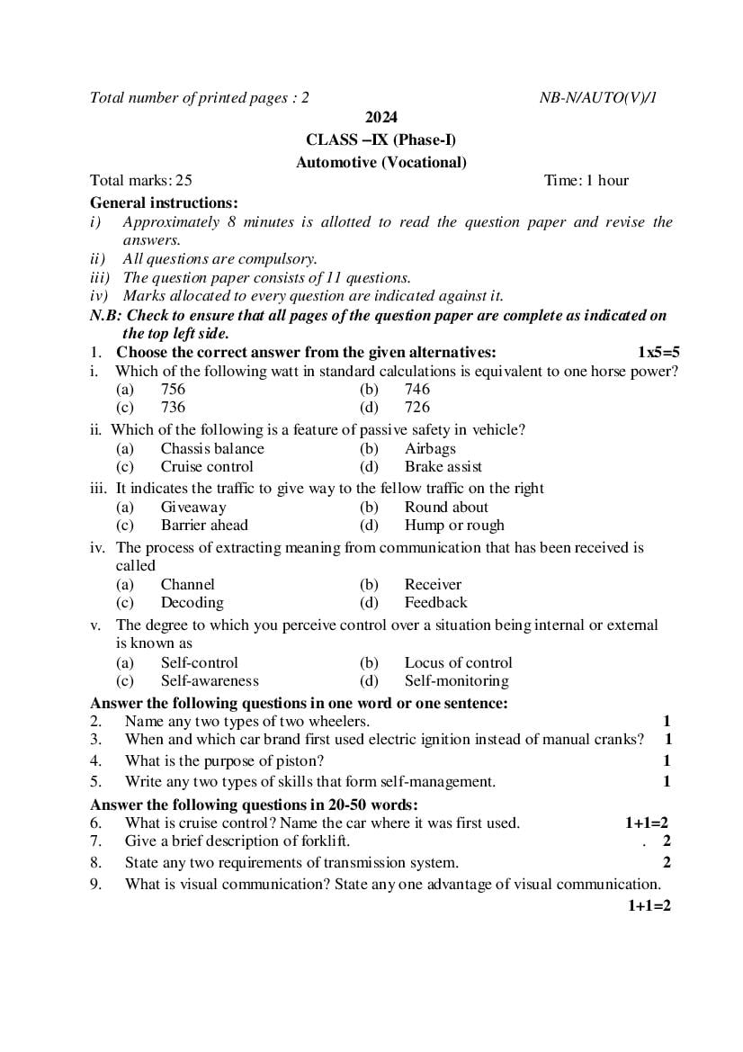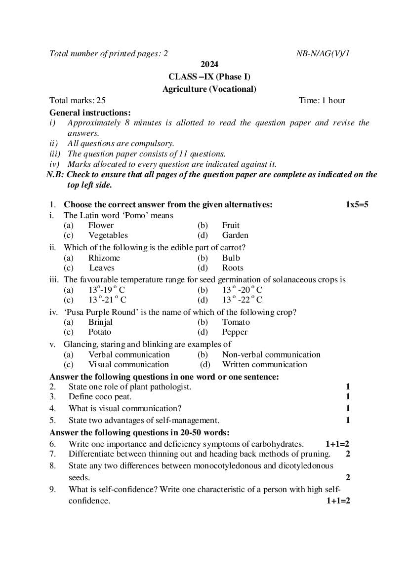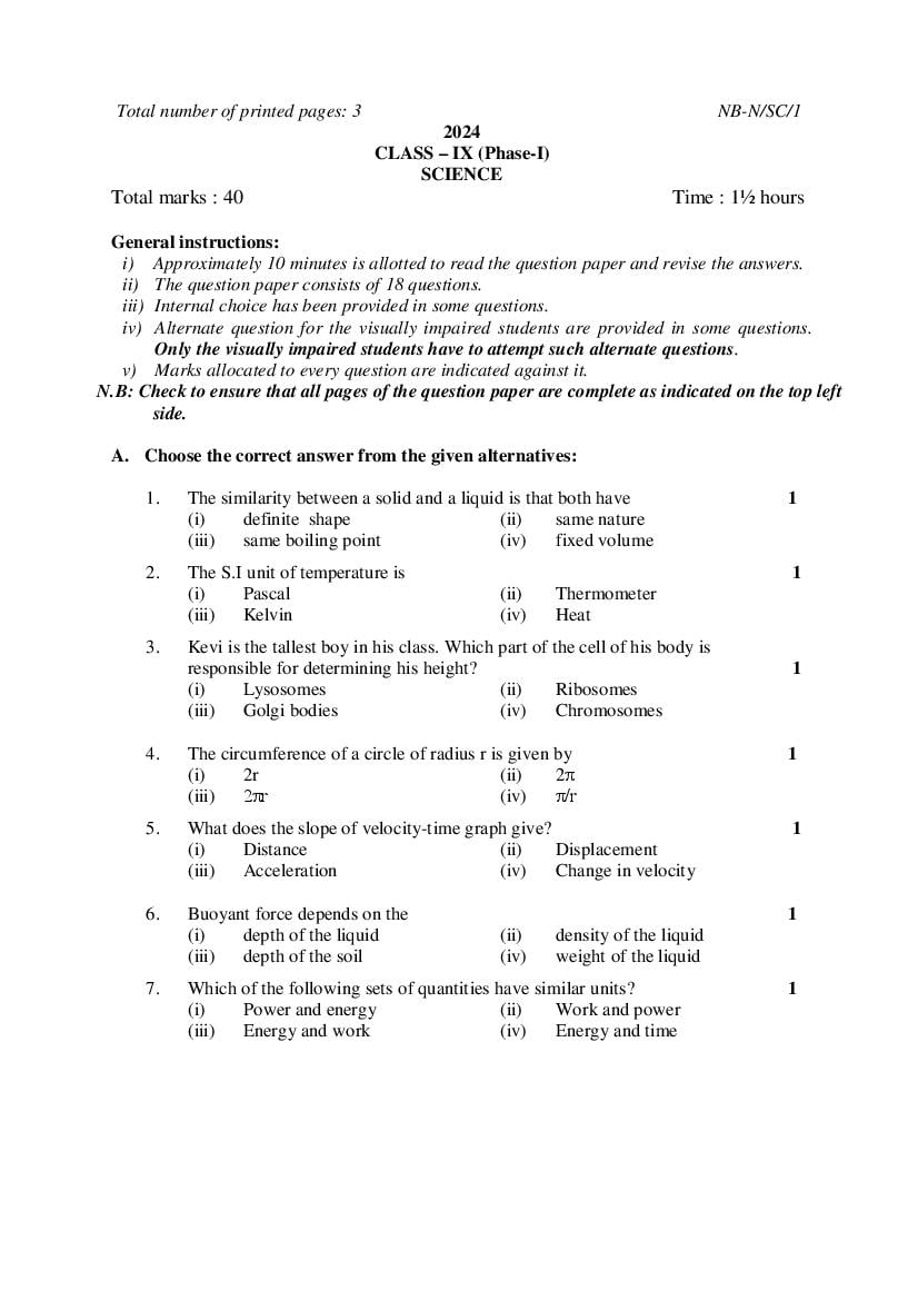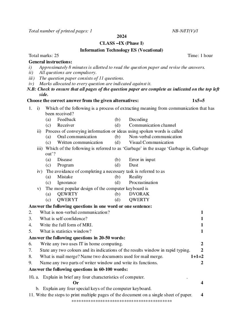 NBSE Class 9 Question Paper 2024-25 Phase 1 View Download