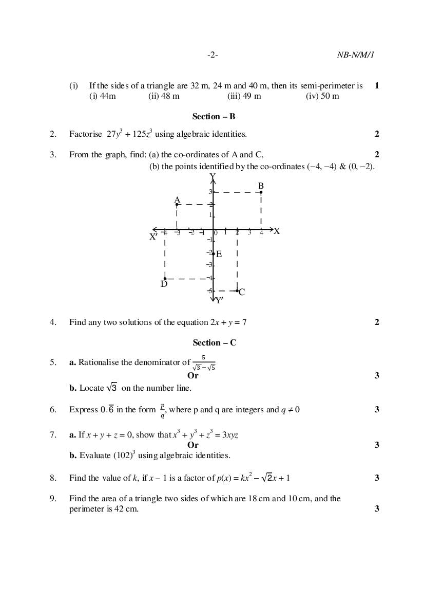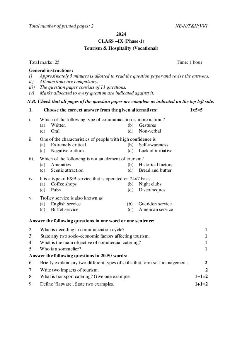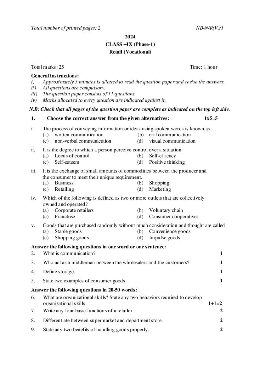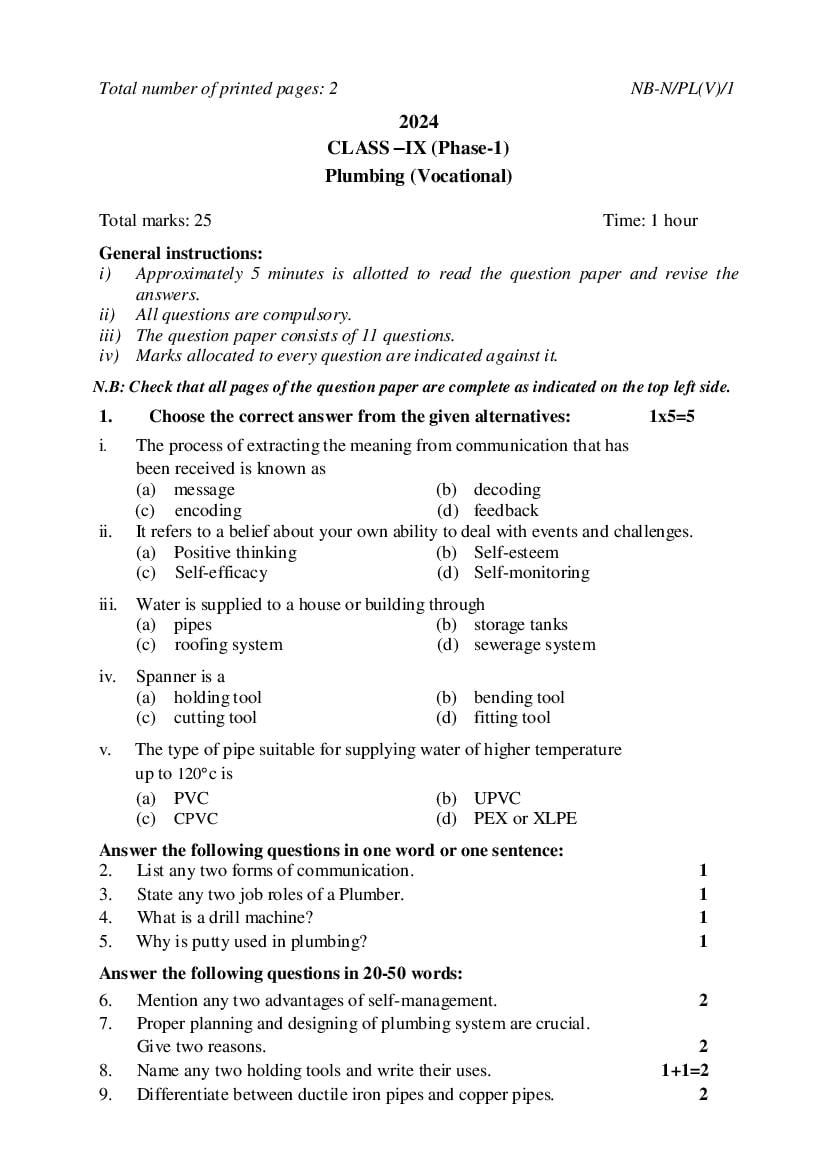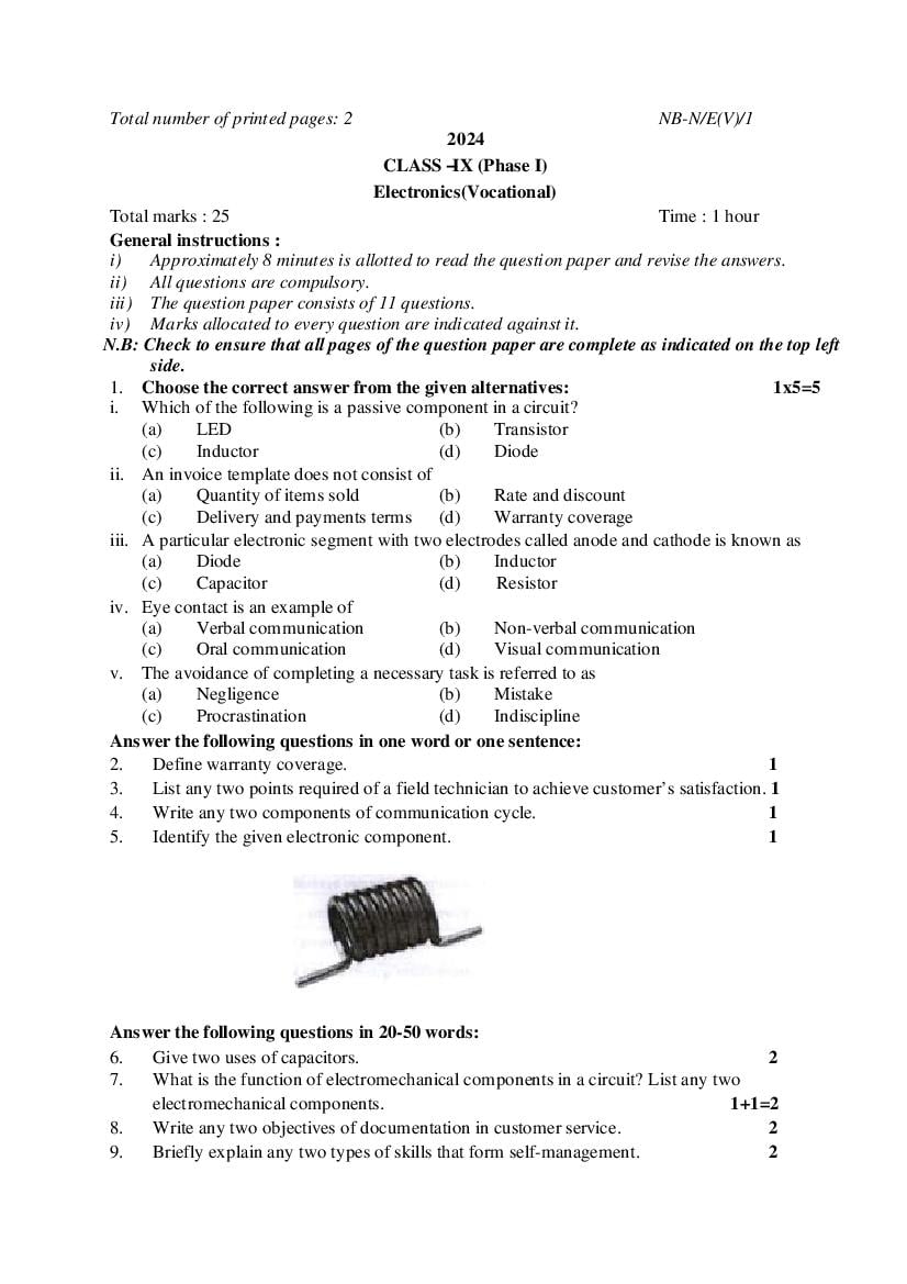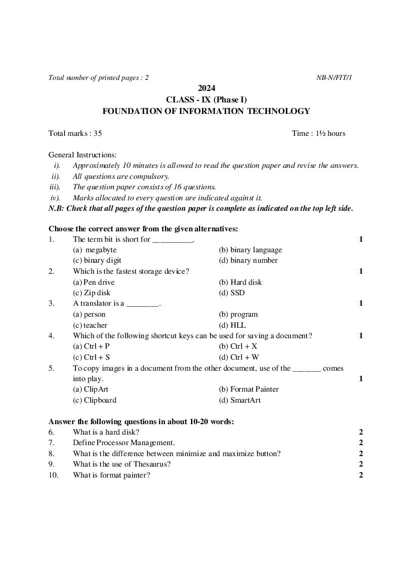 NBSE Class 9 Question Paper 2024-25 Phase 1 View Download