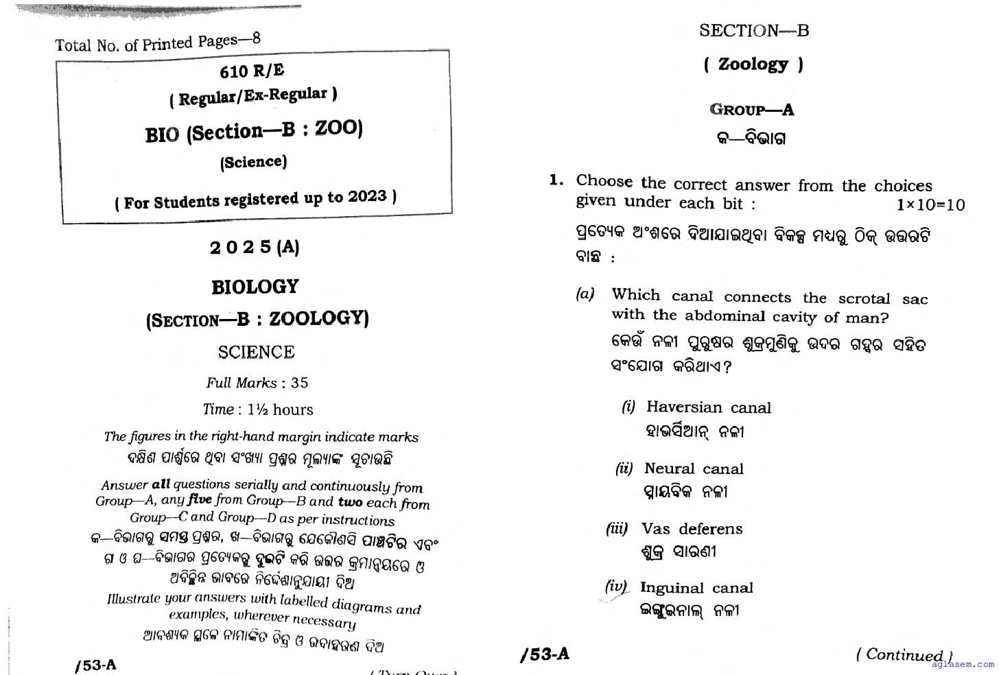 Odisha Class 12 Question Paper 2025 Biology Zoology View Download