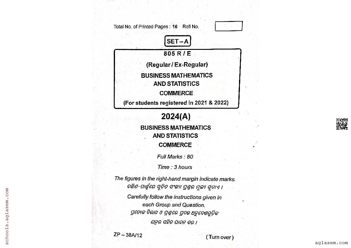 Odisha Class 12 Question Paper 2024 Business Mathematics and Statistics View Download