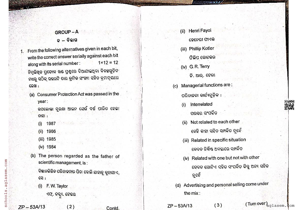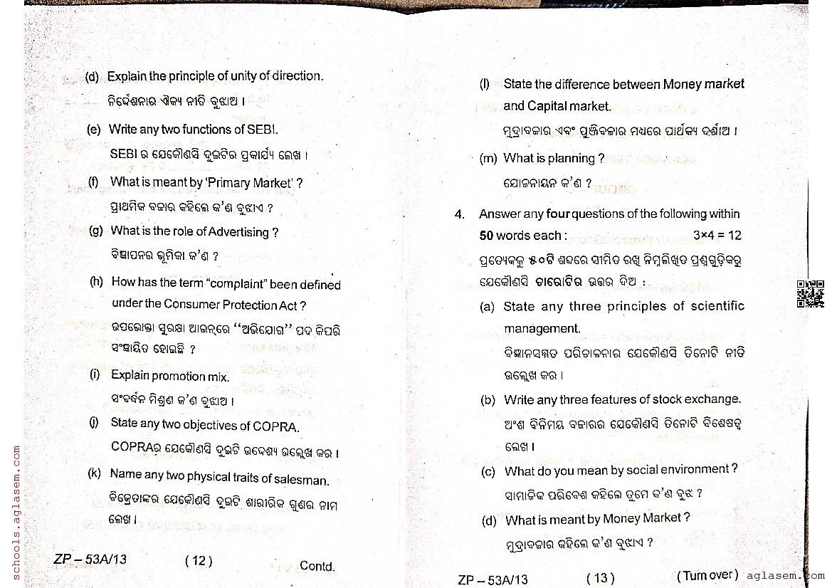 The Odisha Board Exam Question Paper of Class 12 12 Business Studies and Management is as follows.