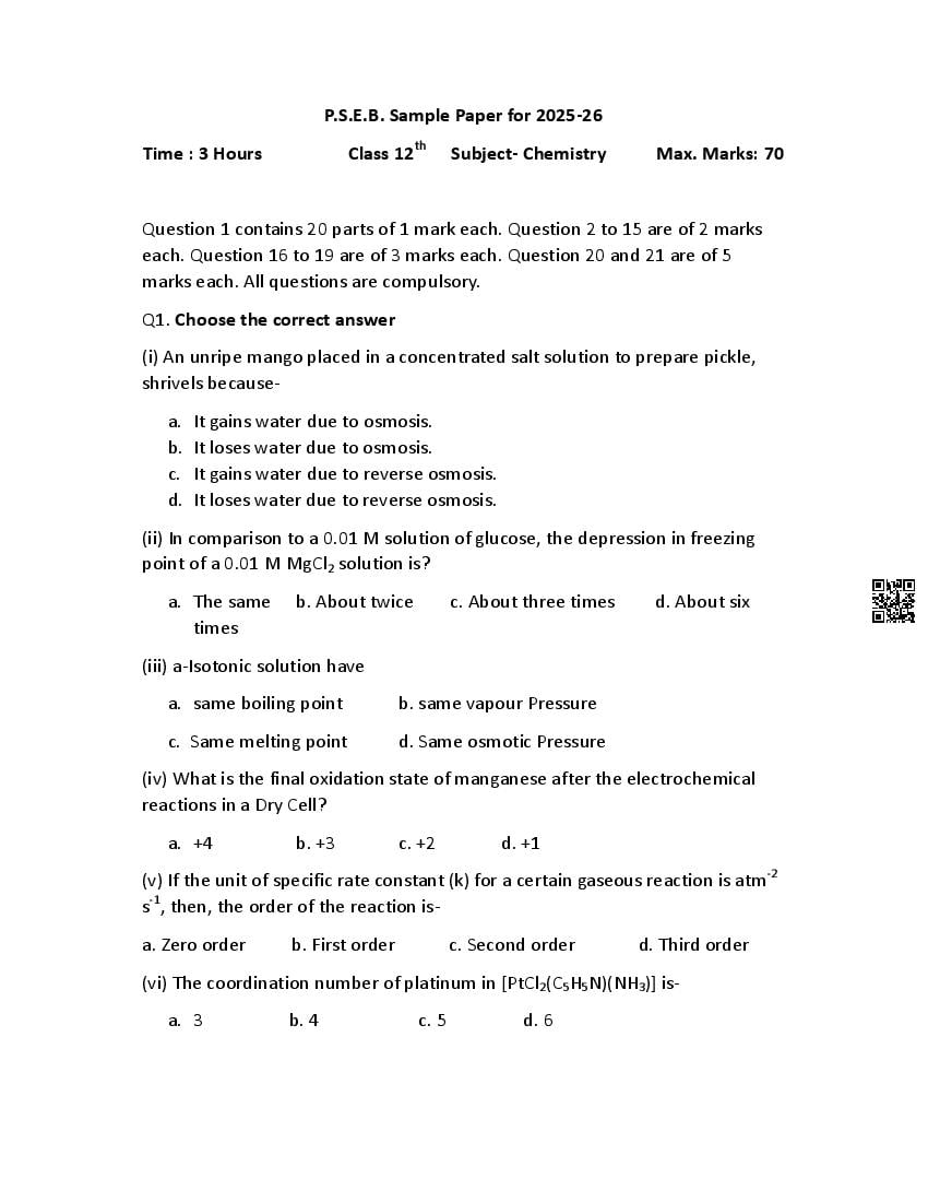 PSEB 12th Sample Paper 2026 Chemistry View Download