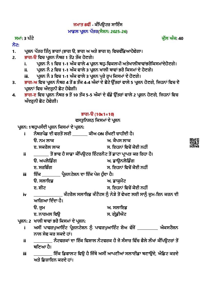 PSEB 8th Sample Paper 2026 Computer Science View Download