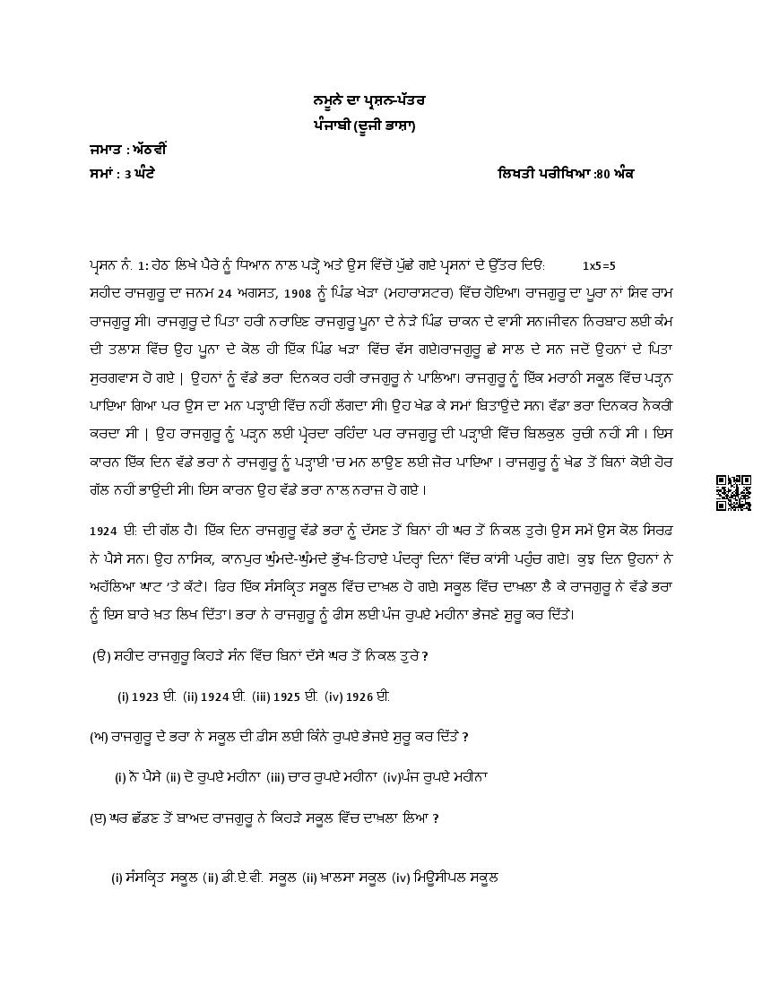 PSEB 8th Punjabi 2nd Language Sample Paper Download Link – Click Here to Download PDF