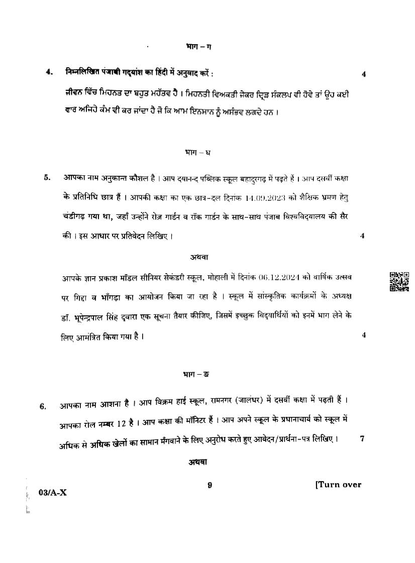 Punjab Board Class 10 Hindi Question Paper 2024 PDF