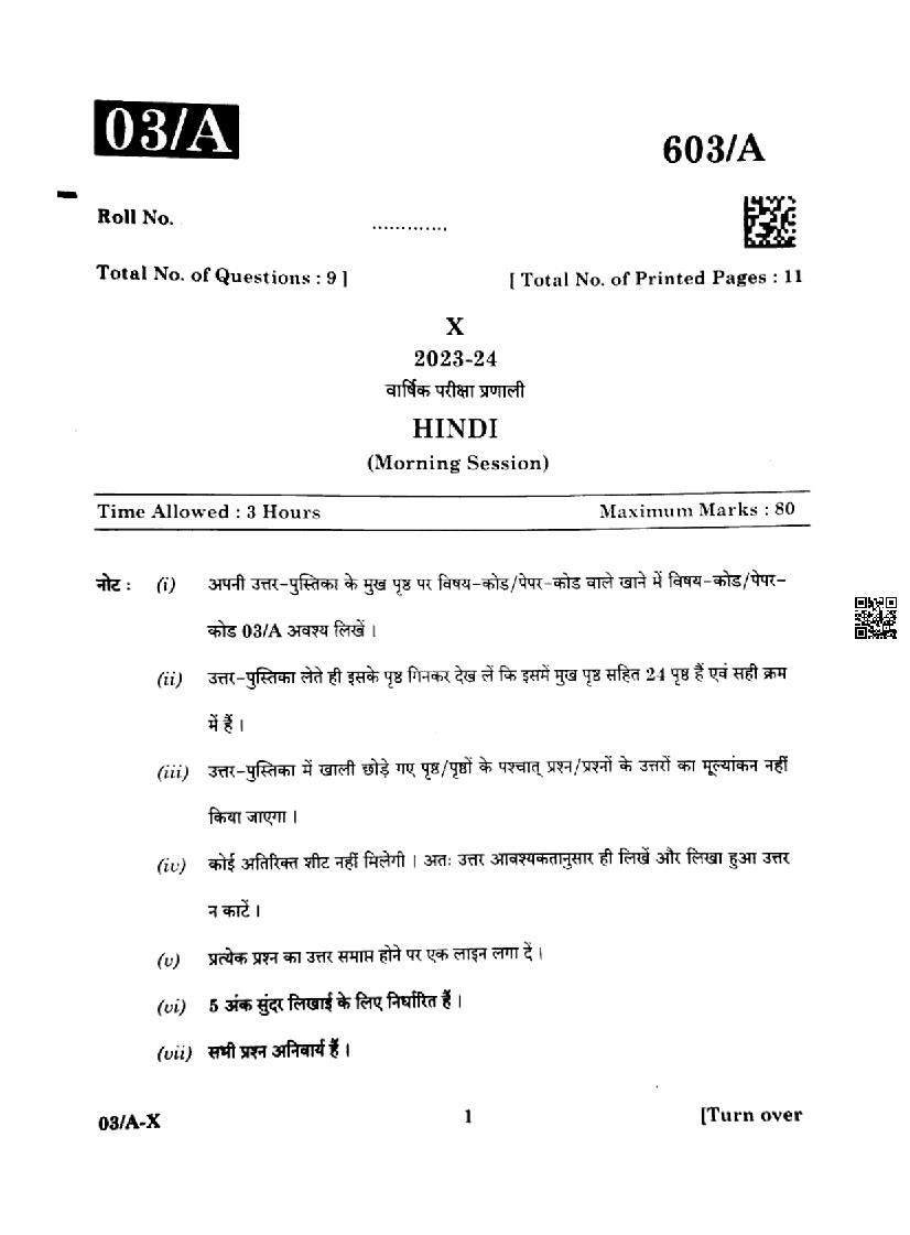Punjab Board Class 10 Question Paper 2024 Hindi View Download