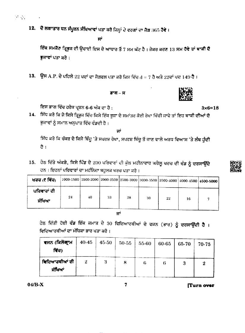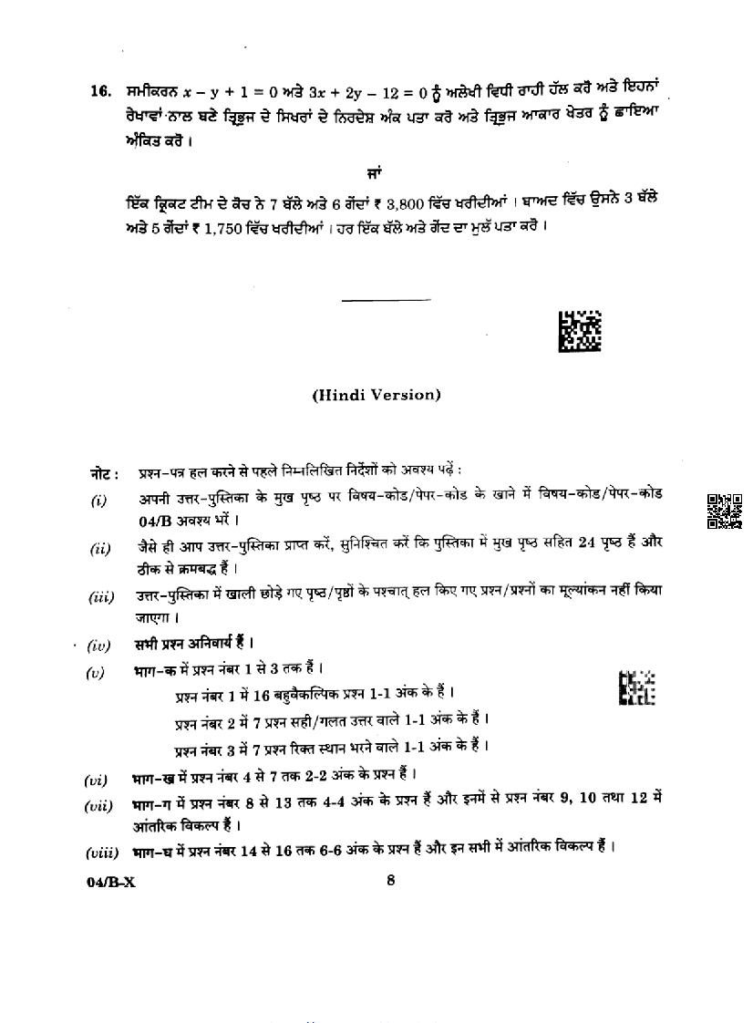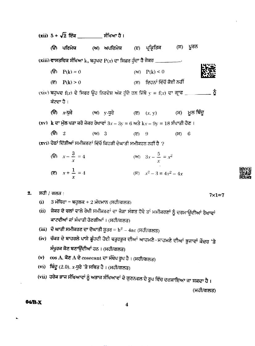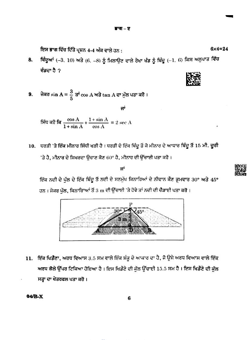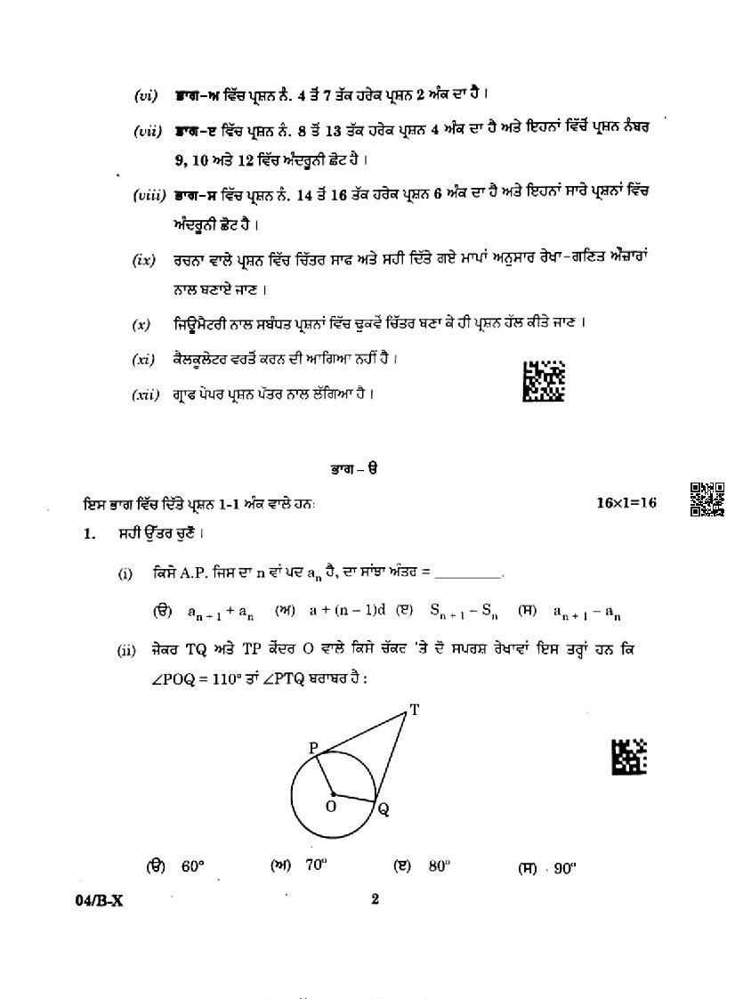 Punjab Board Class 10 Maths Question Paper 2024