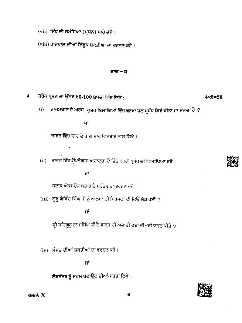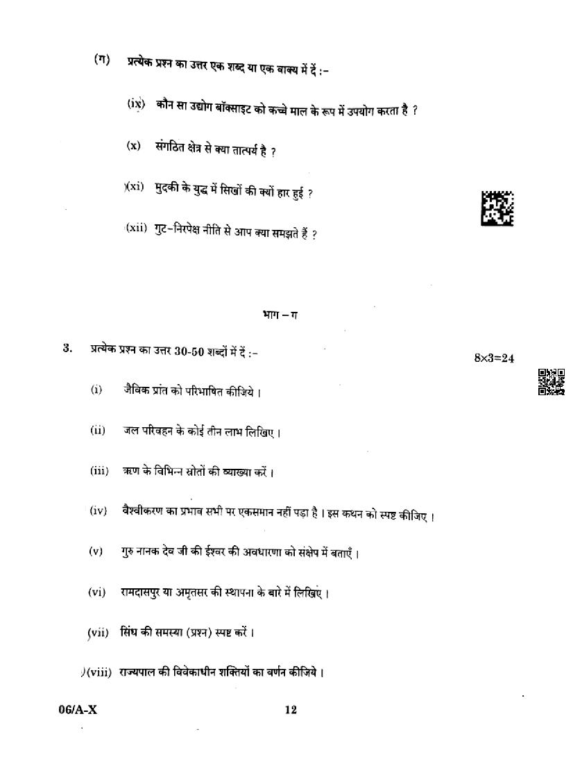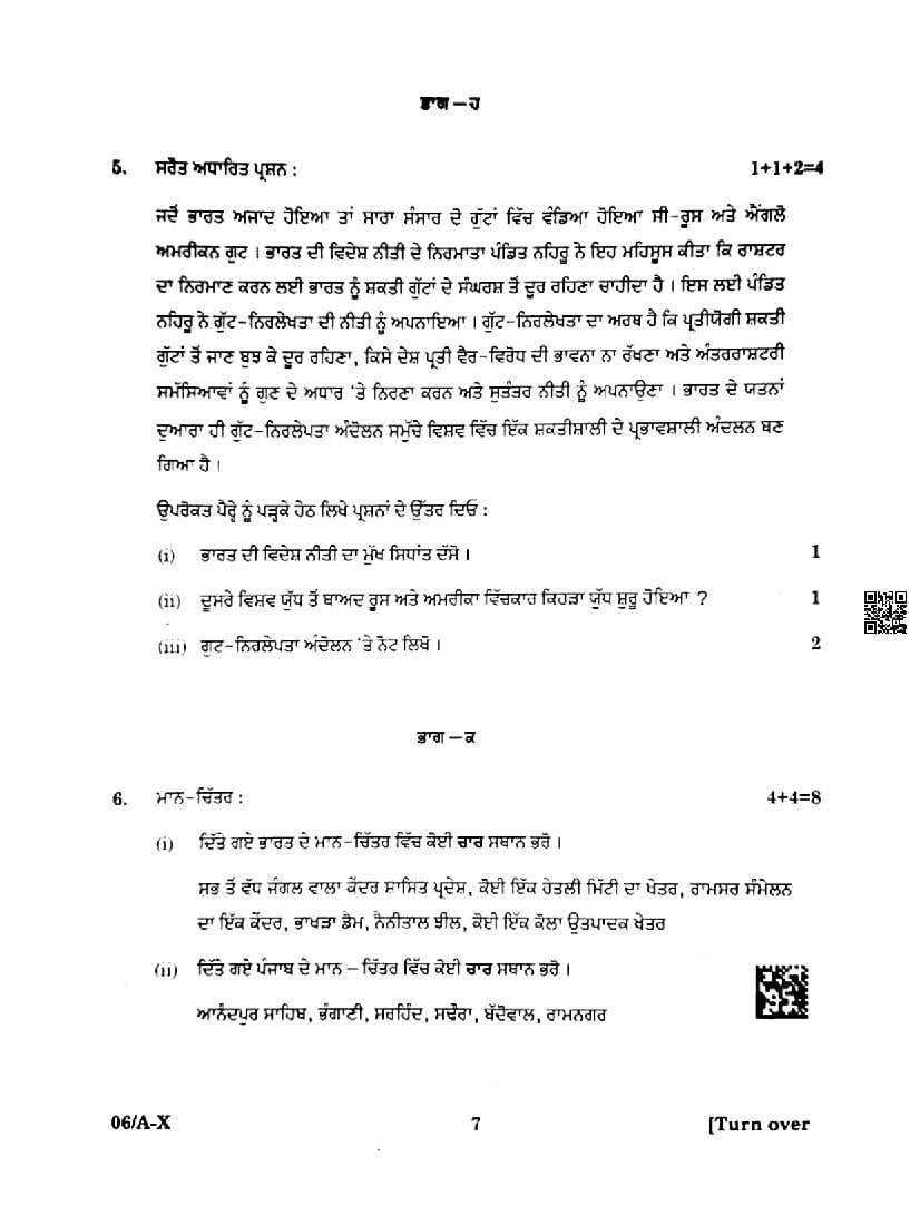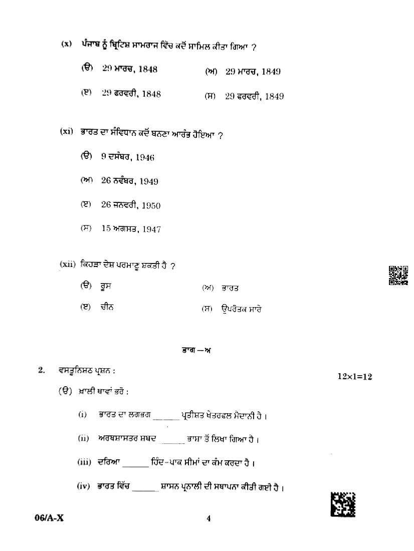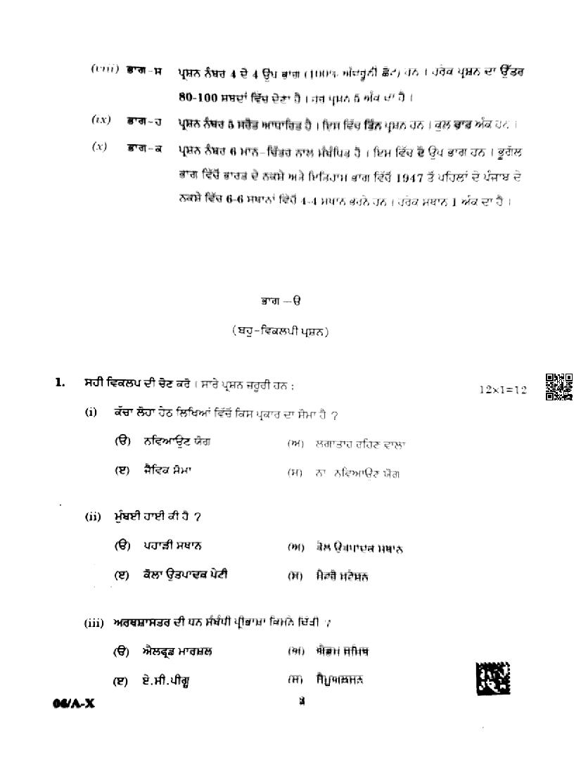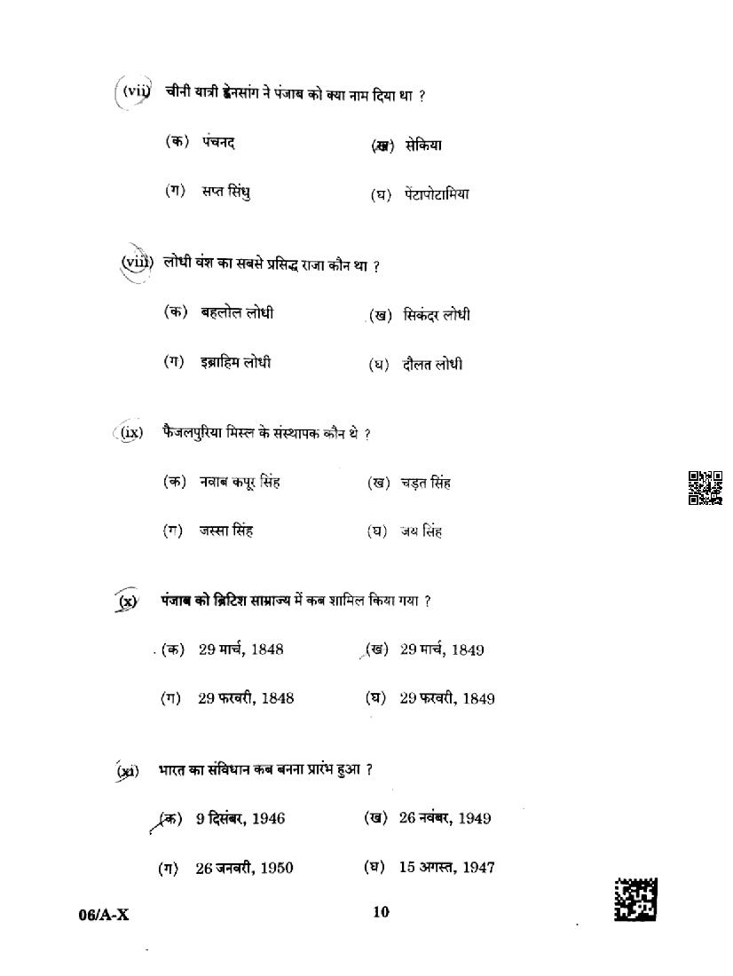Punjab Board Class 10 Social Science Question Paper 2024