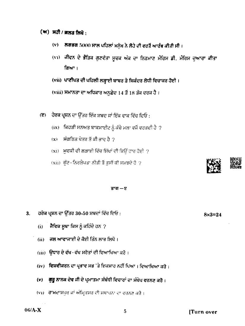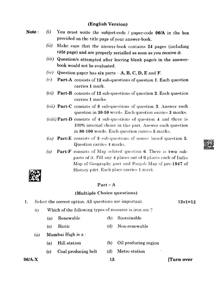 Punjab Board Class 10 Social Science Question Paper 2024 PDF – Download PSEB 10th PYQP