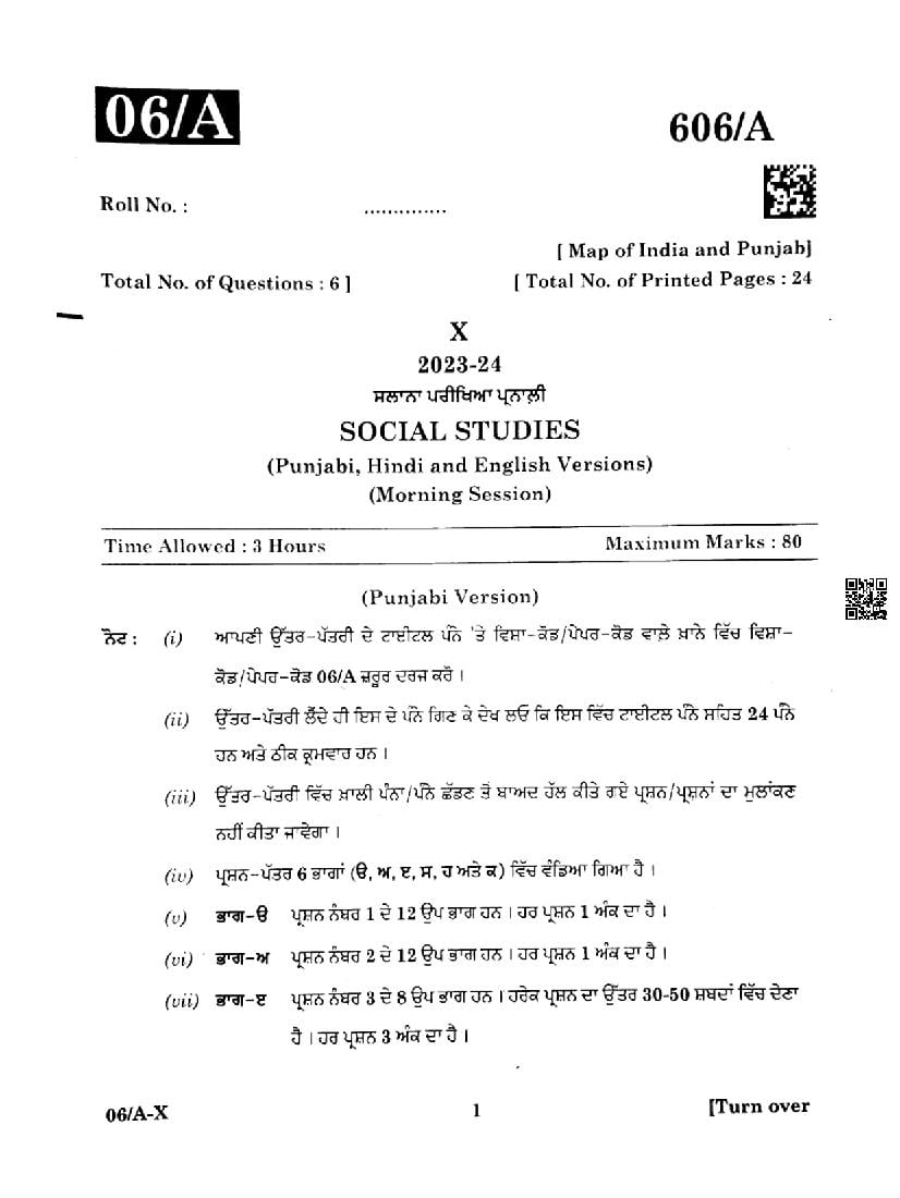 Punjab Board Class 10 Social Science Question Paper 2024 PDF