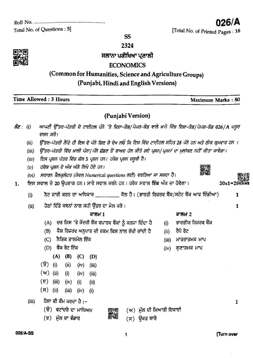 Punjab Board Class 12 Economics Question Paper 2024 PDF
