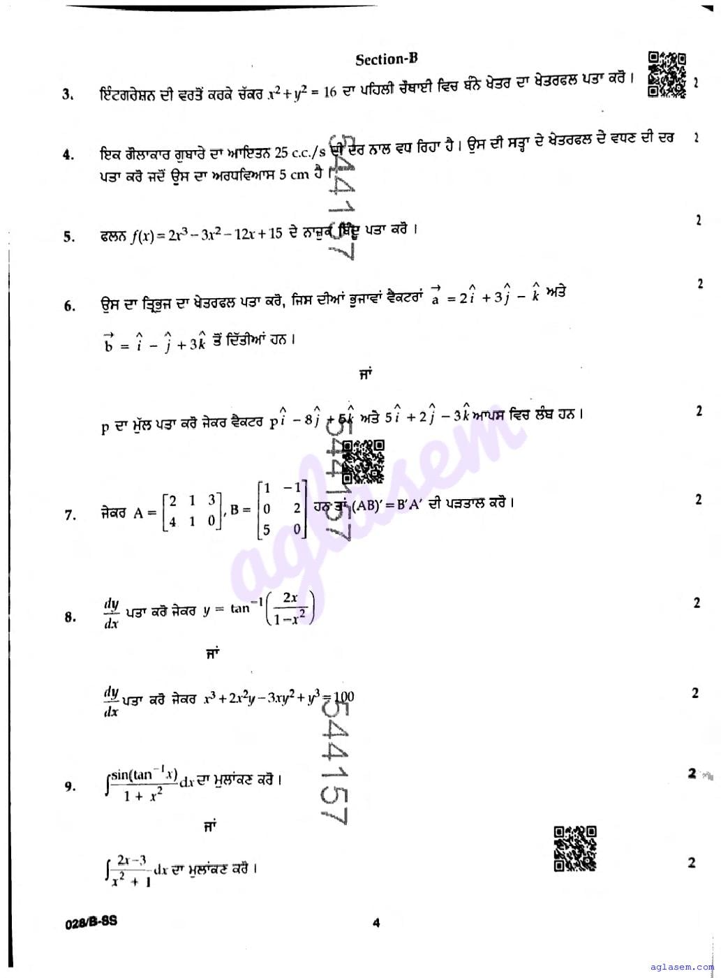 Punjab Board Class 12 Mathematics Question Paper 2026