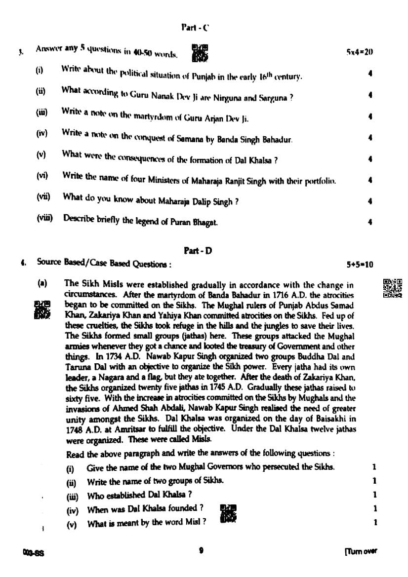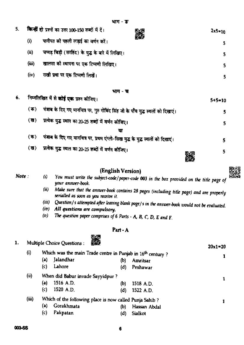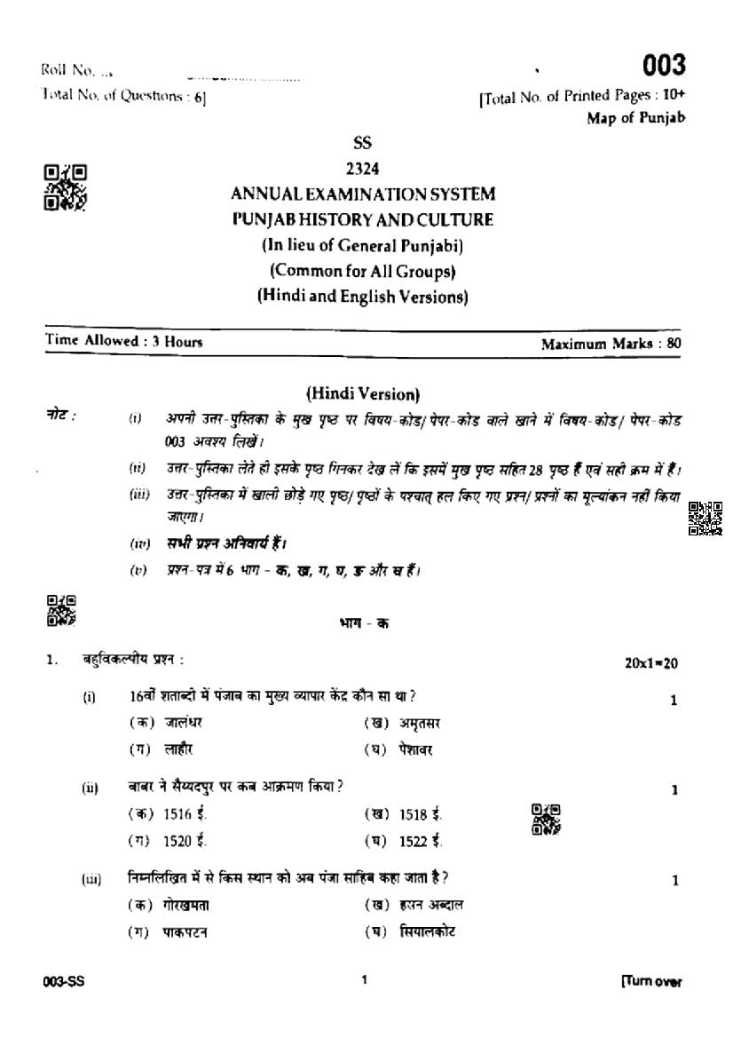 | Study Material Here | Punjab Board Previous Year Question Paper of Class 12 Punjabi History and Culture |