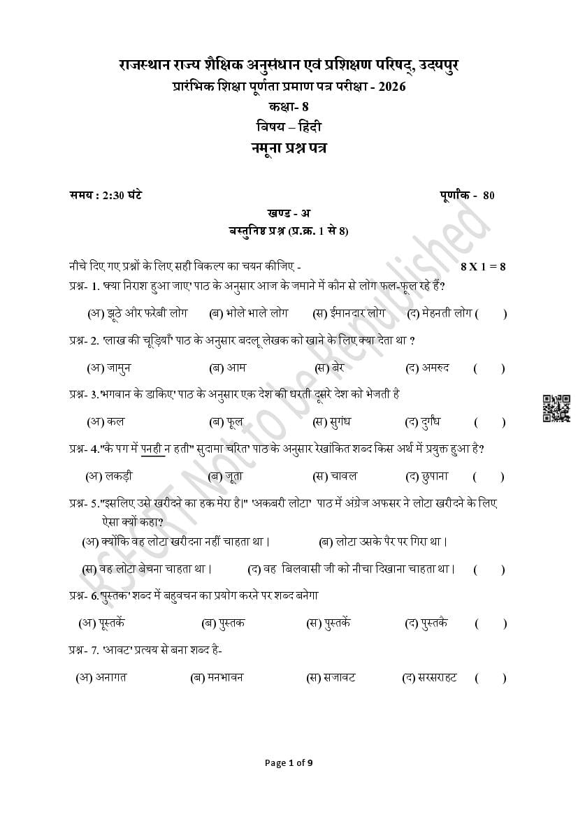 Rajasthan Board Class 8th Model Question Paper 2026 Hindi View Download