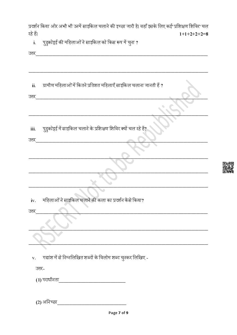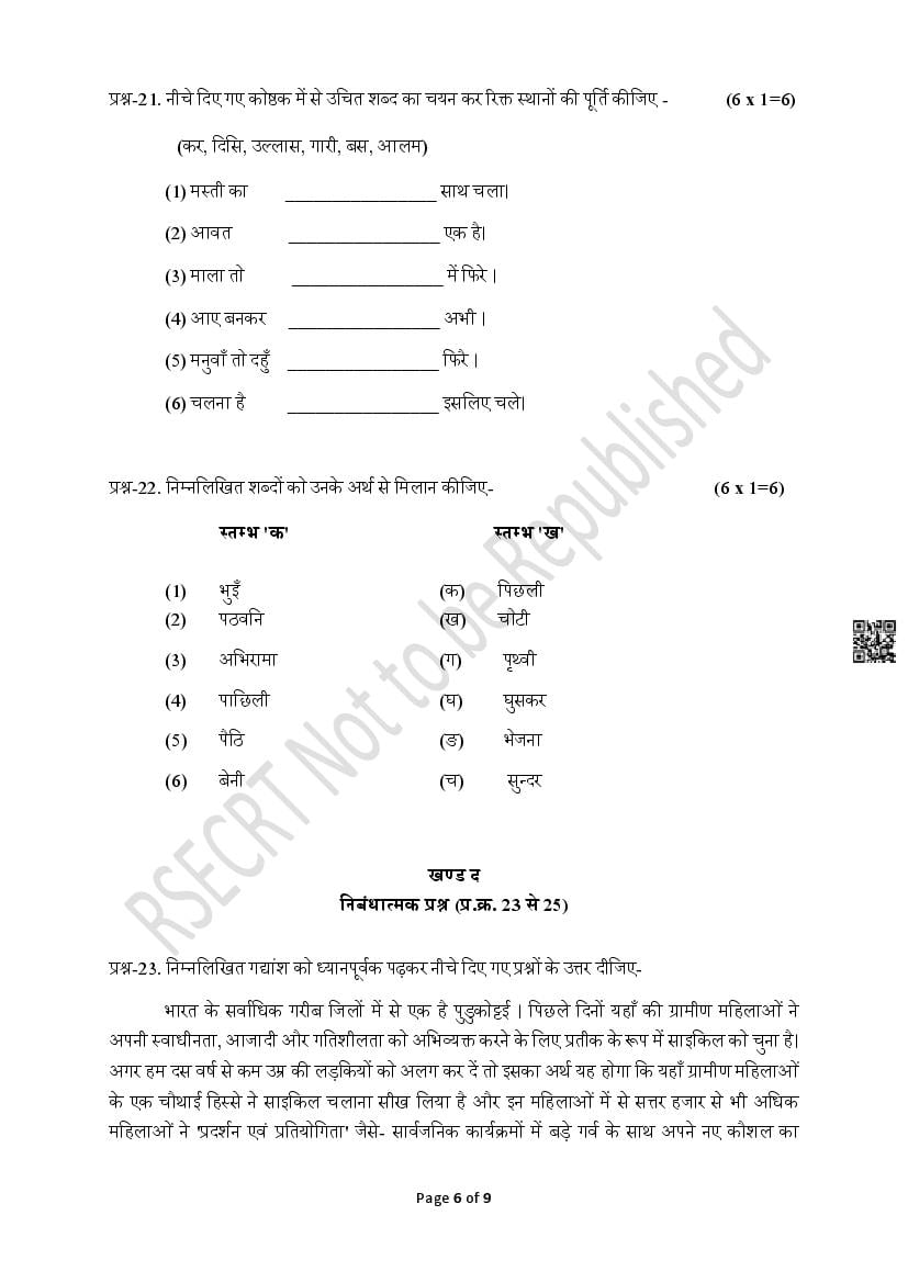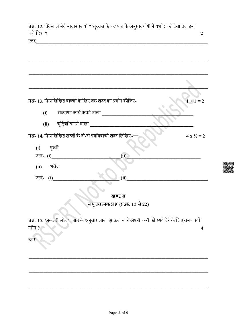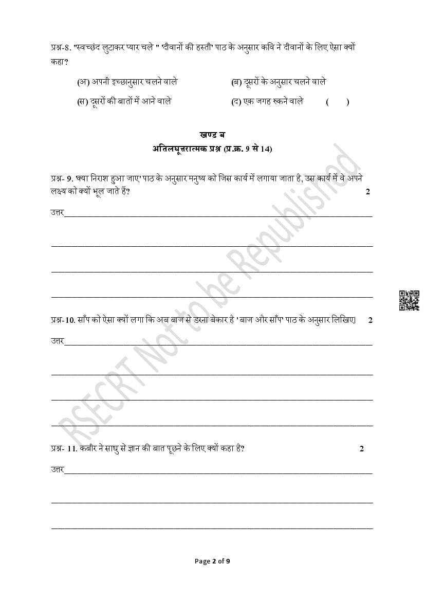 The Rajasthan Board model paper for class 8 Hindi is as follows.