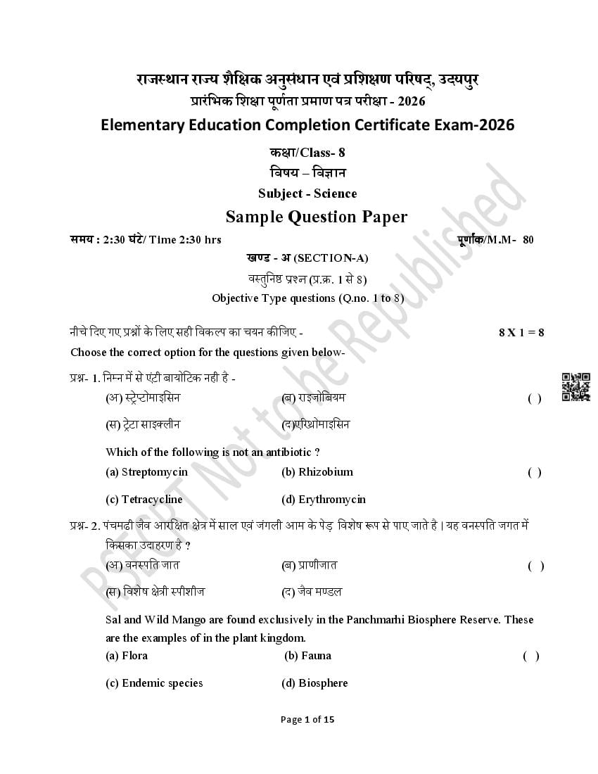 Rajasthan Board Class 8th Model Question Paper 2026 Science View Download