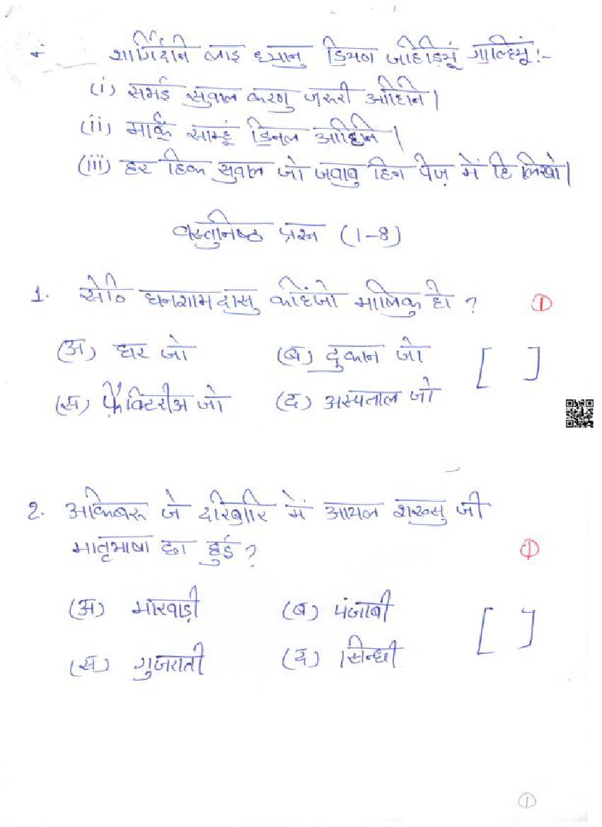 The Rajasthan Board model paper for class 8 Sindhi is as follows.