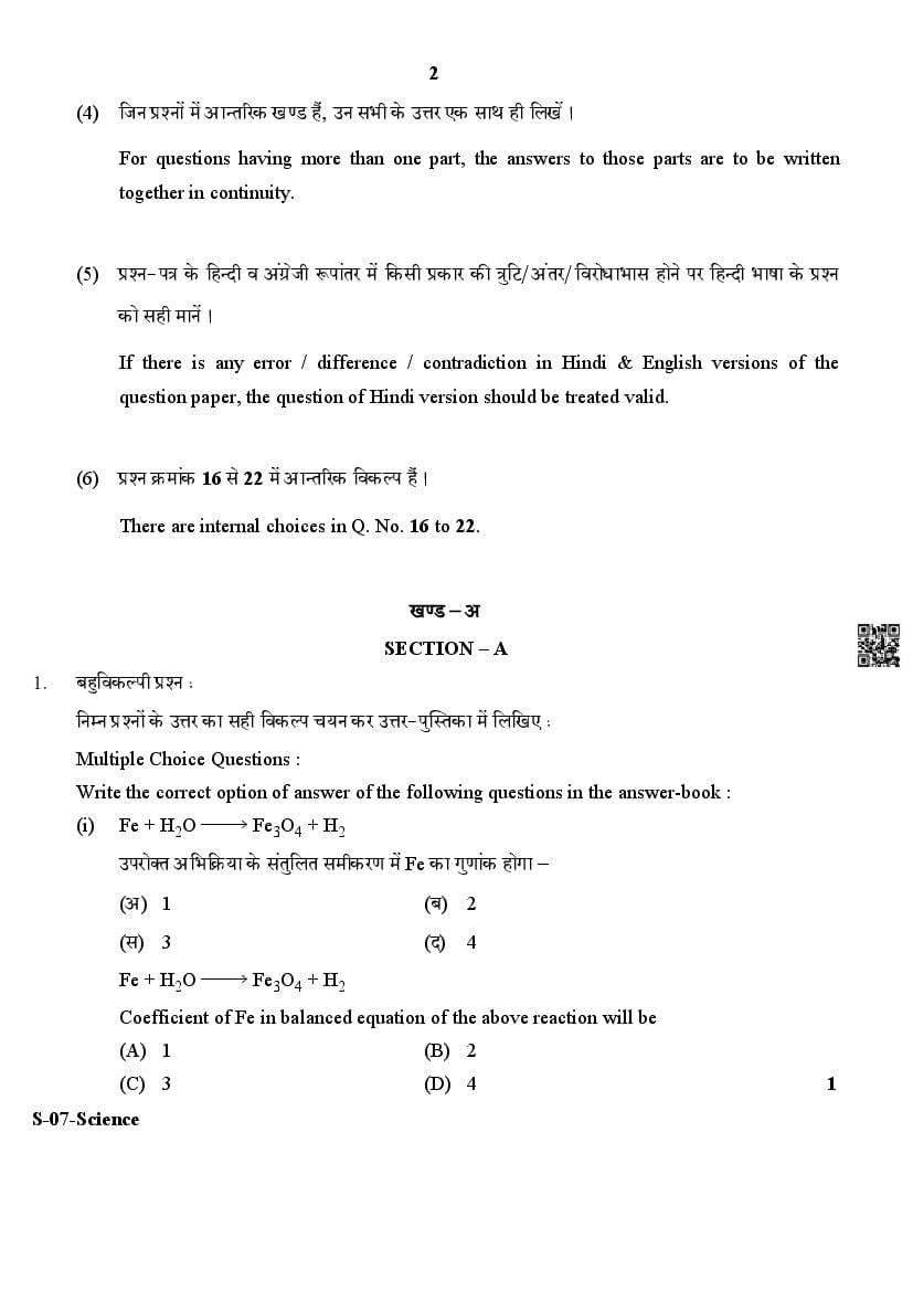 Rajasthan Board Class 10 Science Question Paper