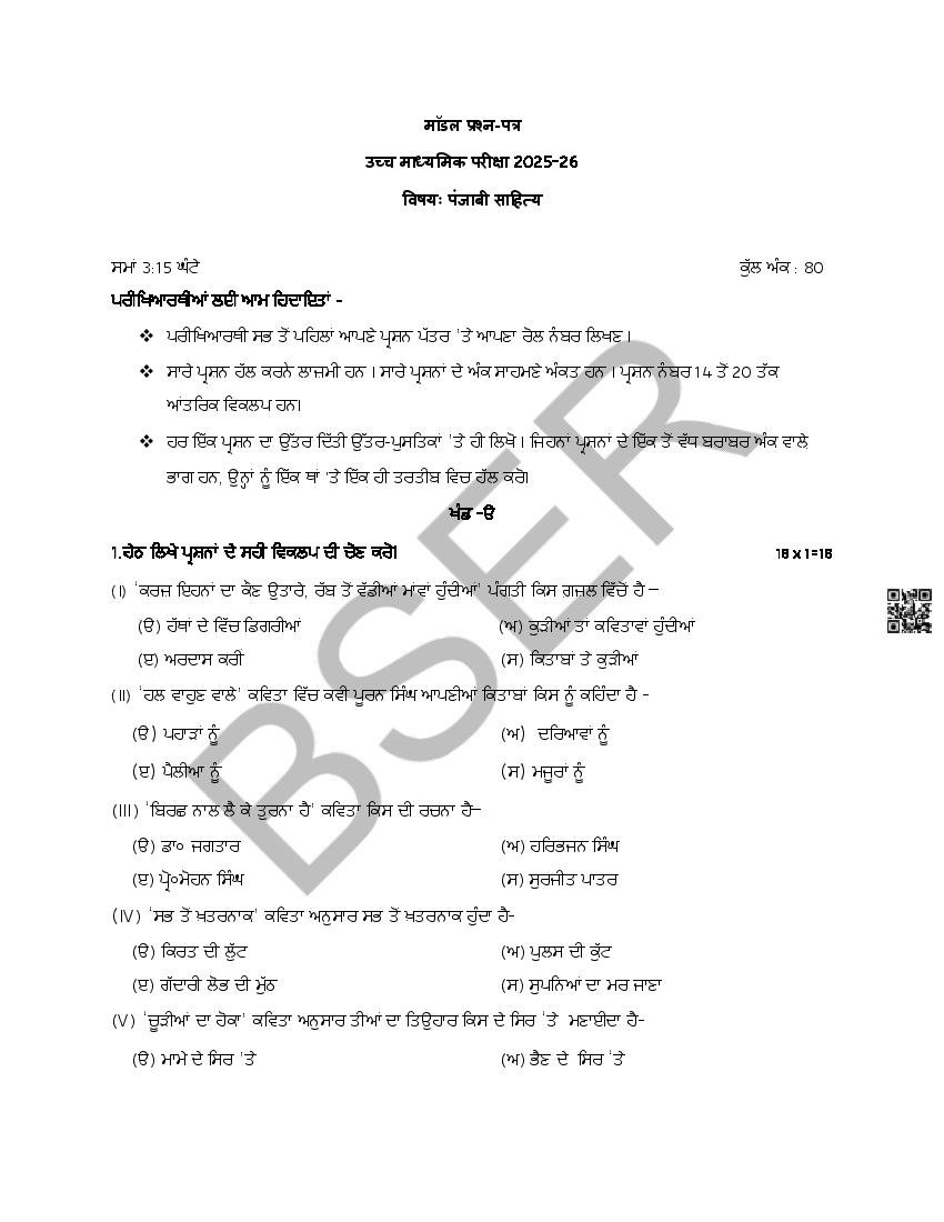 Rajasthan Board 12th Model Paper 2026 Punjabi Literature View Download