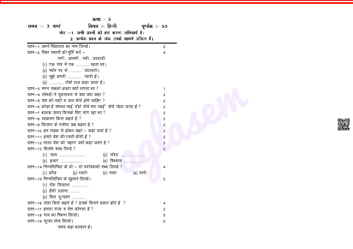 The important details of this 3rd class half yearly exam Hindi question paper are as follows.