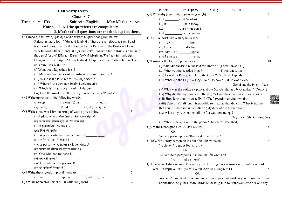 RBSE Class 7 Half Yearly Exam Question Paper English View Download